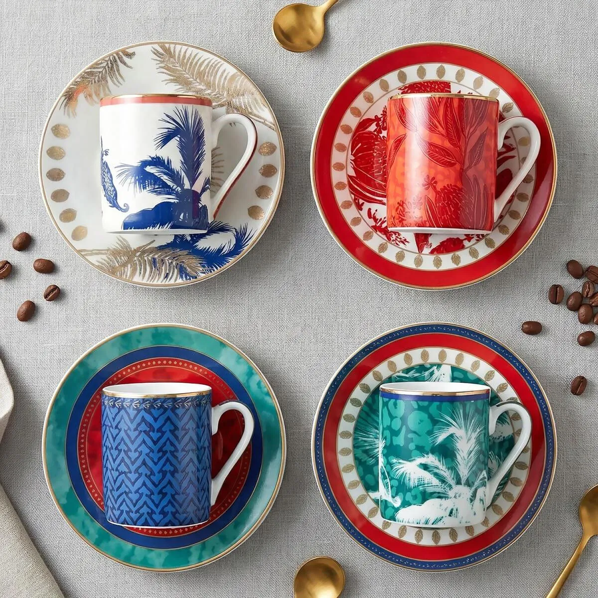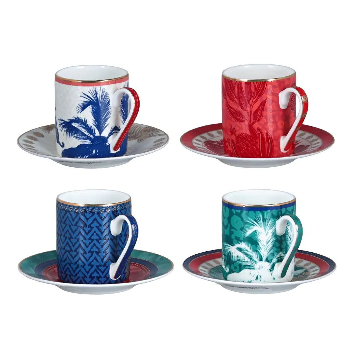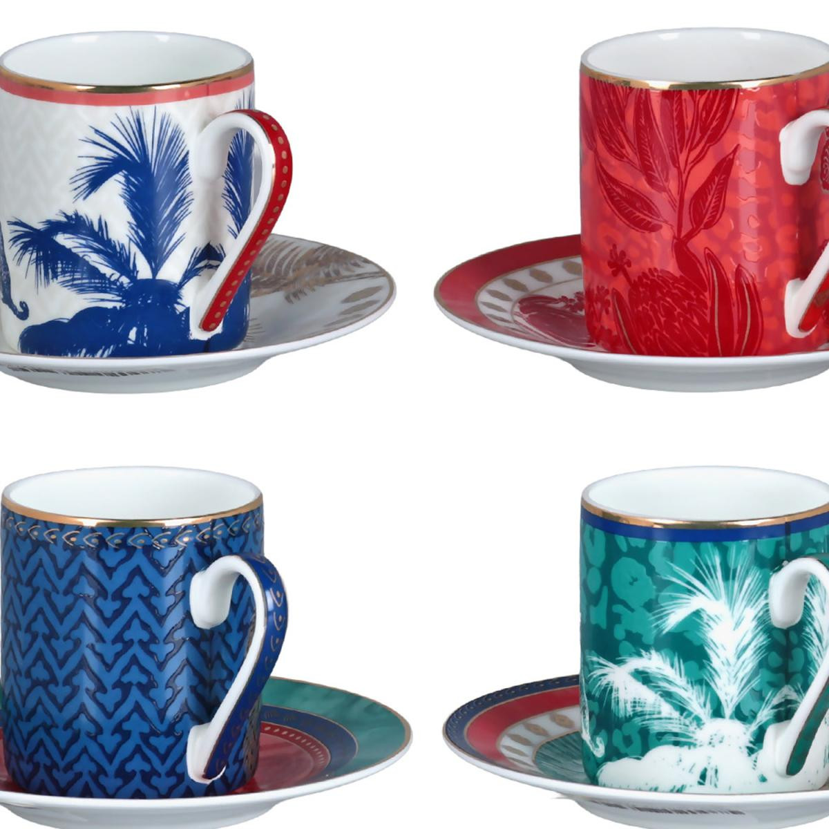 Zengin ve Renkli Tasarım: Set; kırmızı, turkuaz, lacivert ve desenli çerçeve detaylarıyla süslenmiş, egzotik illüstrasyonlara sahip 4 adet farklı kahve fincanı ve tabağından oluşmaktadır.