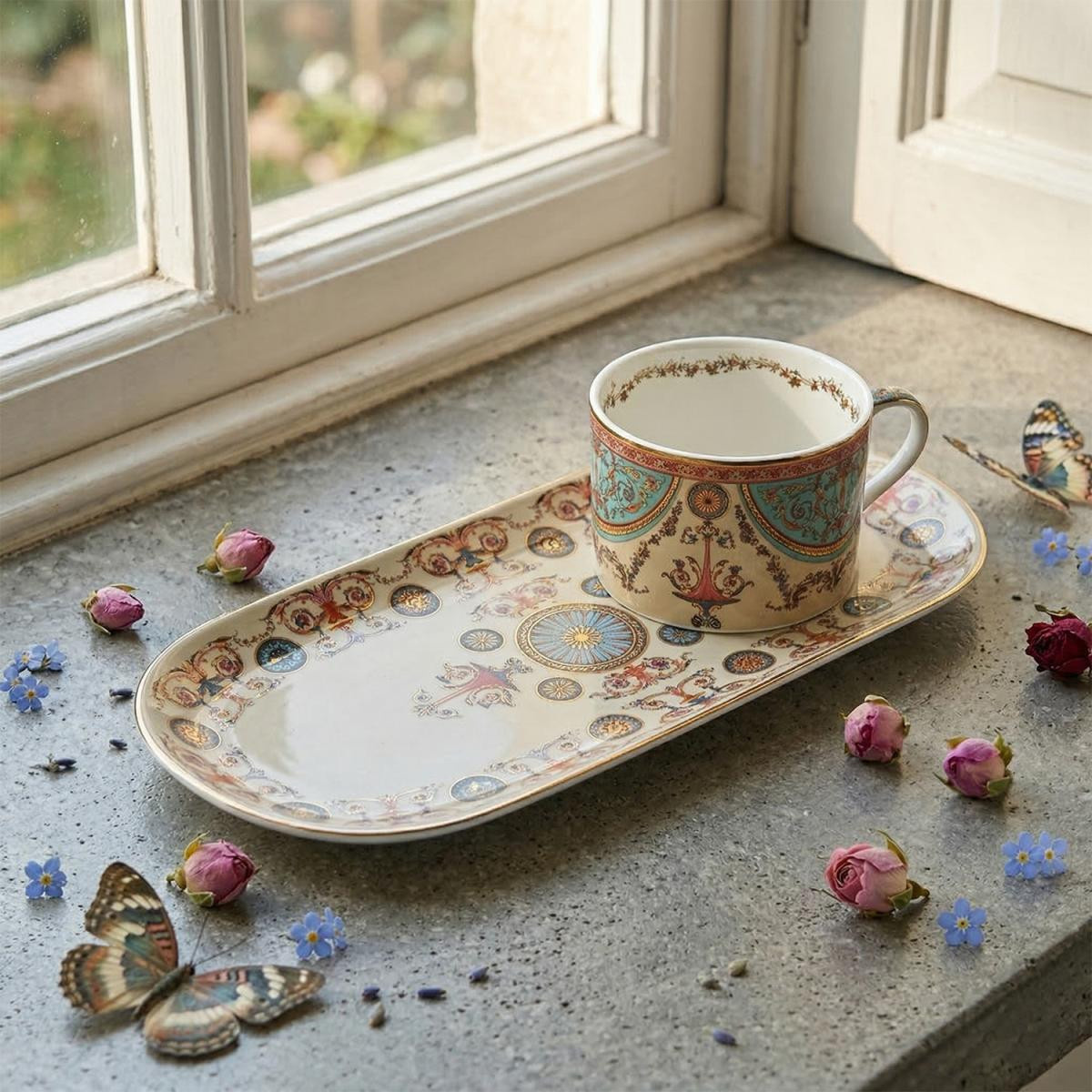 Şık ve Otantik Tasarım: Rosea serisinin derin renk tonları ve altın yaldızlı detayları, masanızda tek kişilik ama ihtişamlı bir saray şıklığı yaratır.