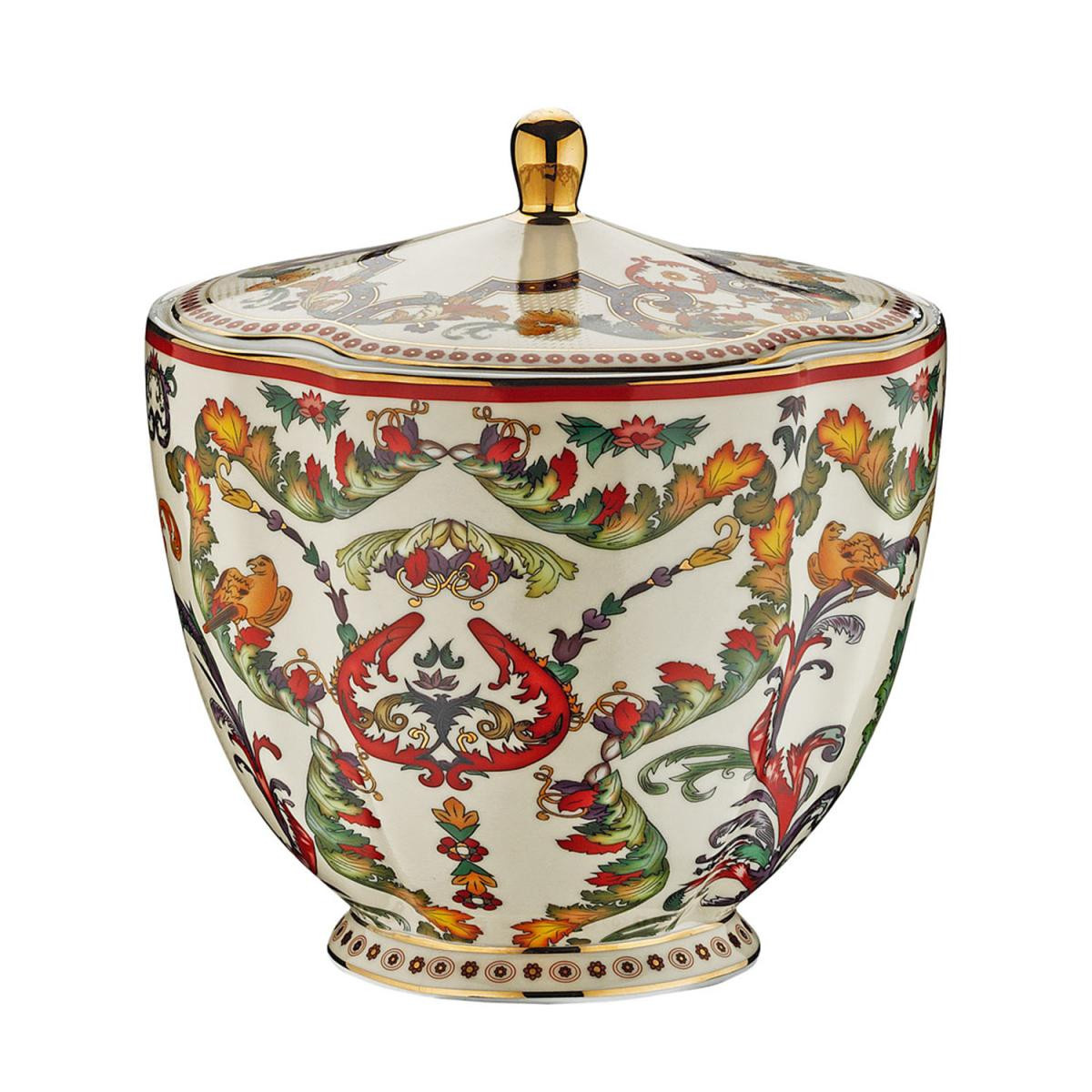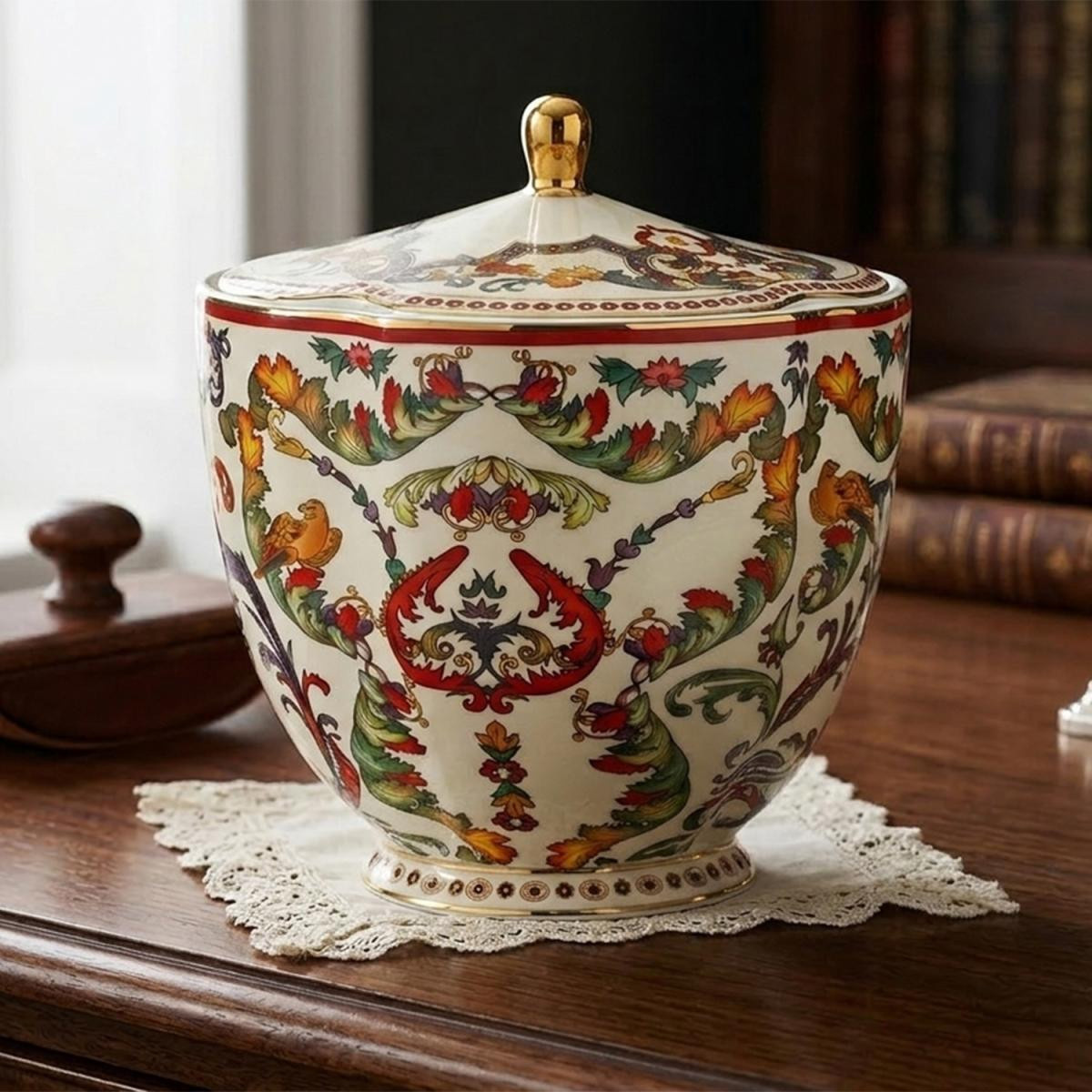 Altın Detaylı Şık Tasarım: Kapak üzerindeki gold (altın rengi) kulp ve kenar yaldızları, karakteristik desenlerle birleşerek masanıza saray şıklığı getirir.