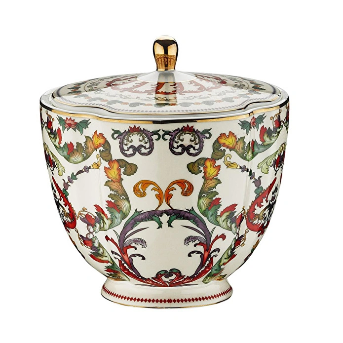 Altın Detaylı Şık Tasarım: Kapak üzerindeki gold (altın rengi) kulp ve kenar yaldızları, karakteristik desenlerle birleşerek masanıza saray şıklığı getirir.