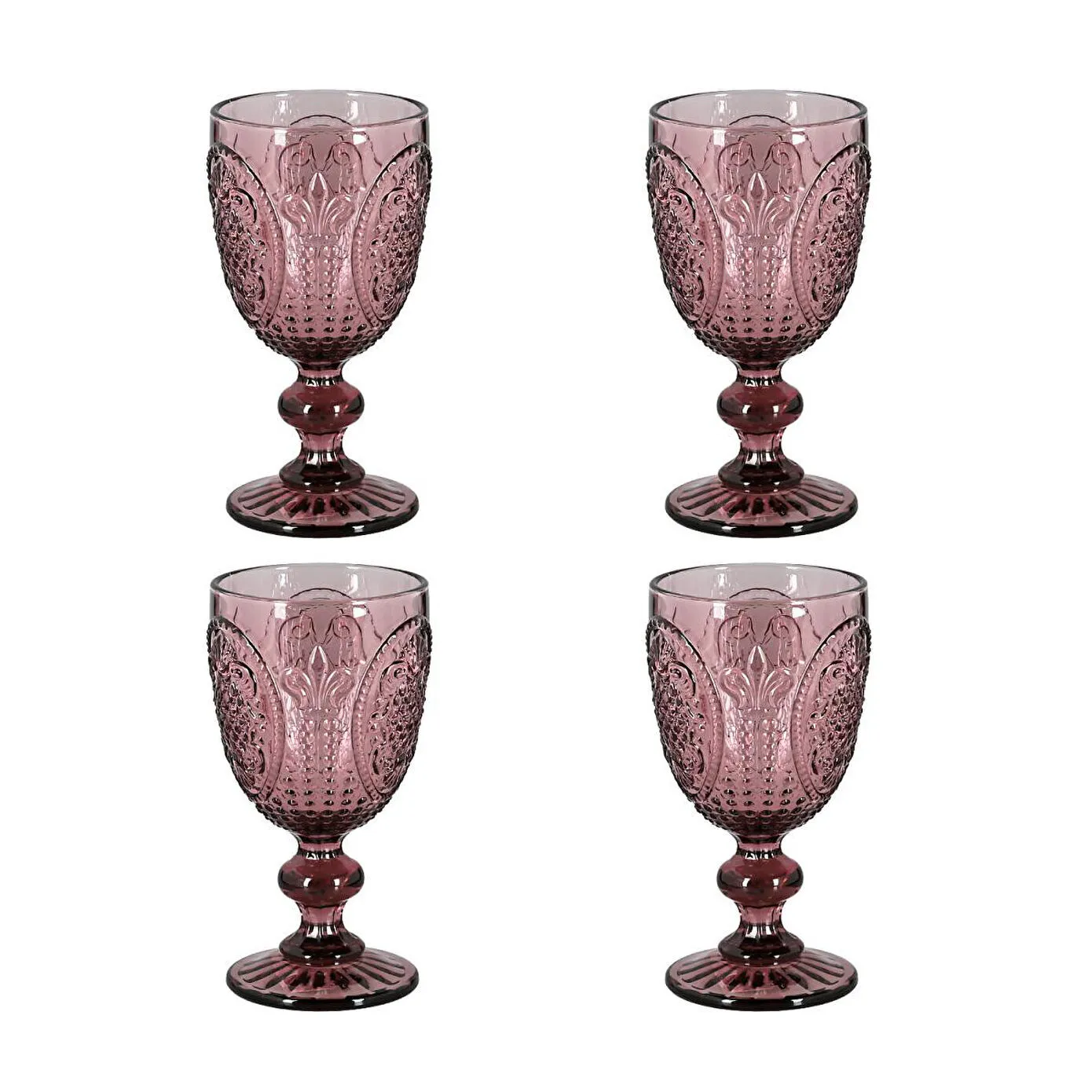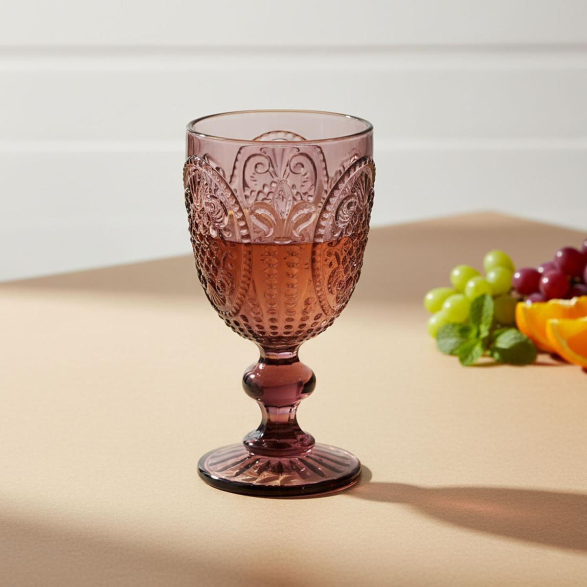 Kadehler, asil ve zarif mor rengindedir. Kadeh kısmı kabartmalı ve dokulu bir yüzeye sahipken, ince ve zarif ayak detayı sunuma şıklık katar.