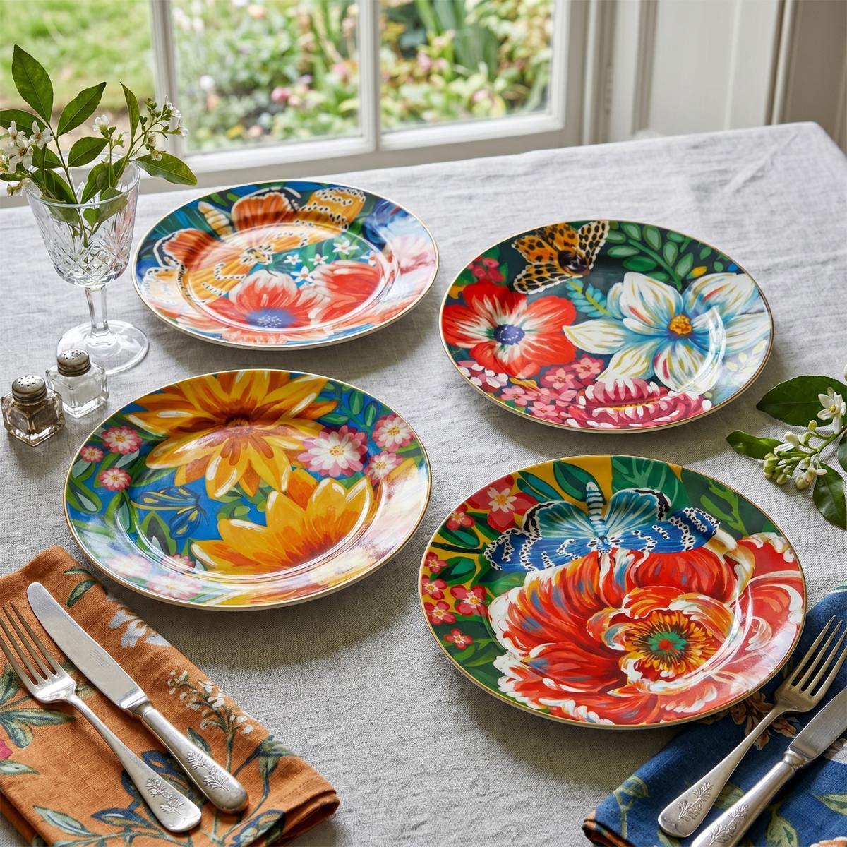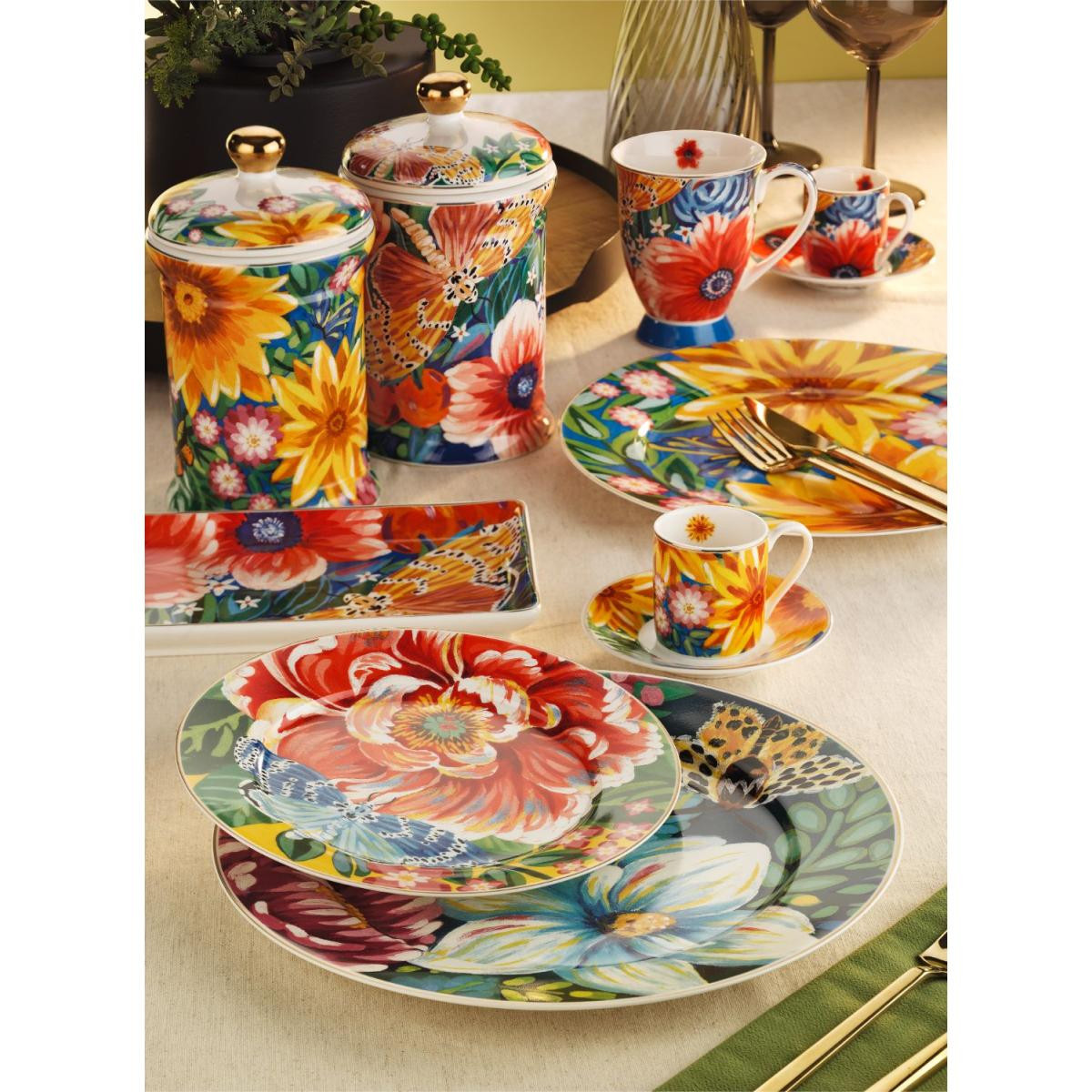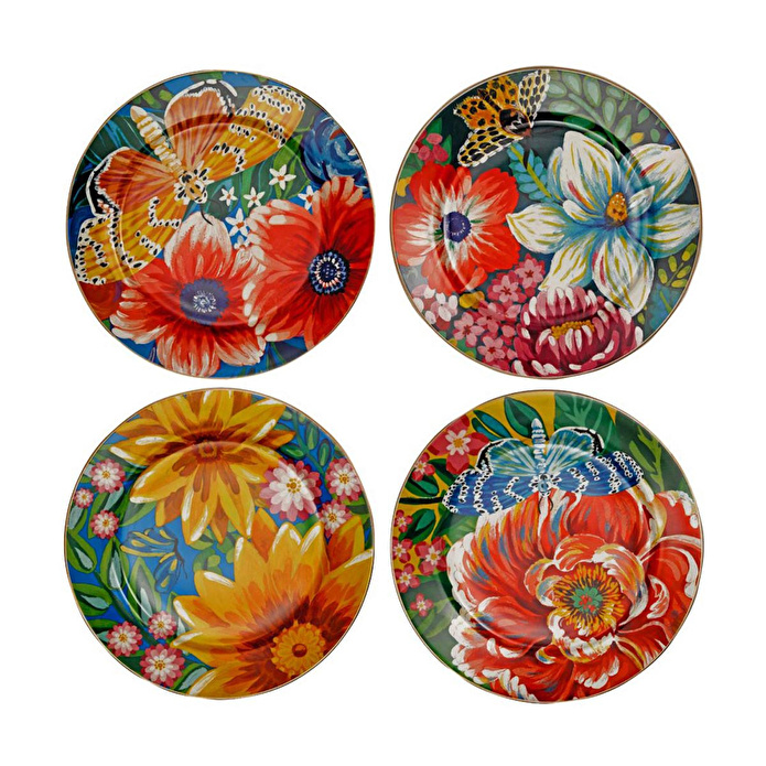 Ana yemek sunumlarınıza doğanın en canlı renklerini ve baharın coşkusunu taşıyın! Vivelle serisinin imzası olan devasa çiçekler, rengarenk kelebekler ve zengin botanik desenlerini porselenin asaletiyle buluşturan bu 4'lü servis seti, sofranızda adeta yaşayan bir bahçe atmosferi yaratır.