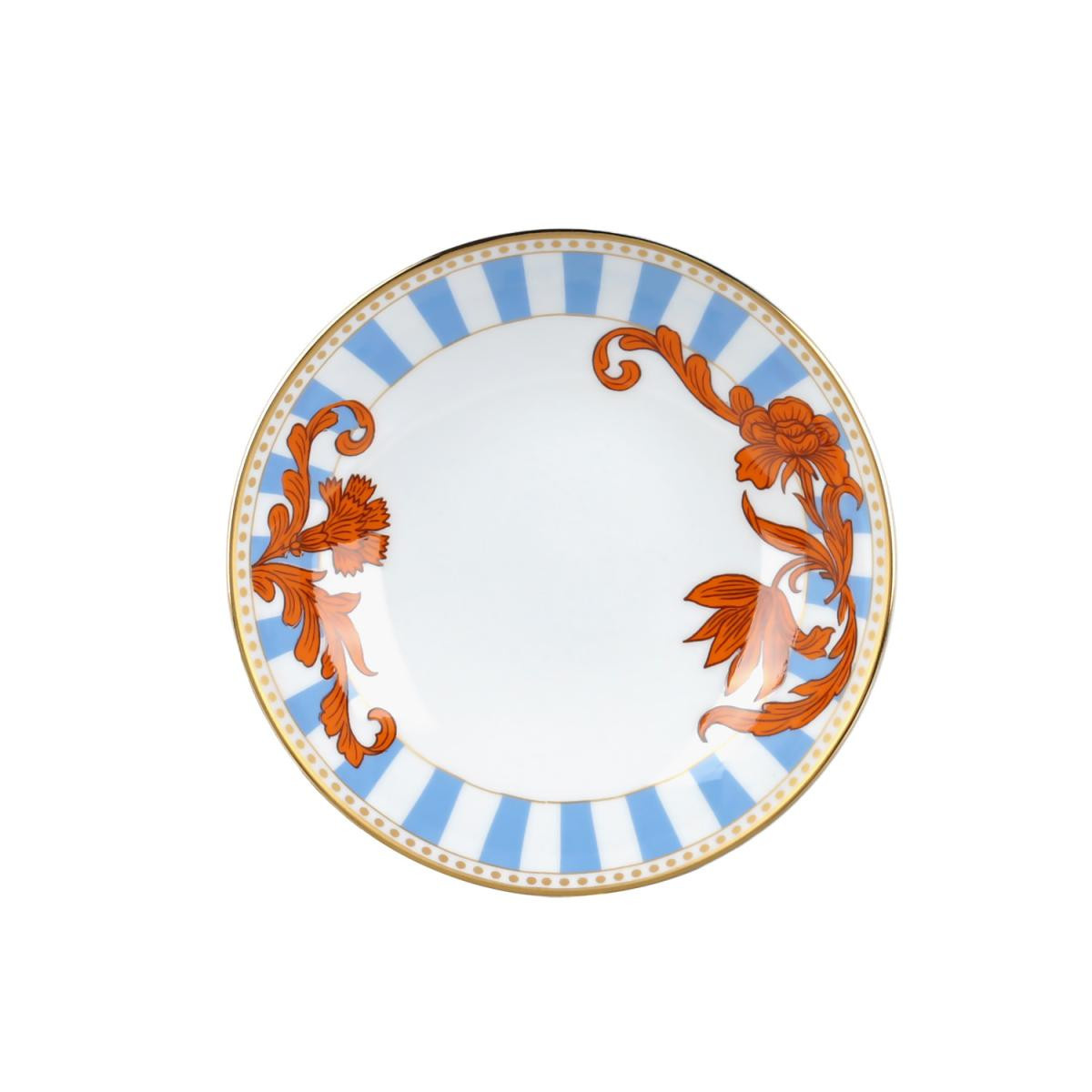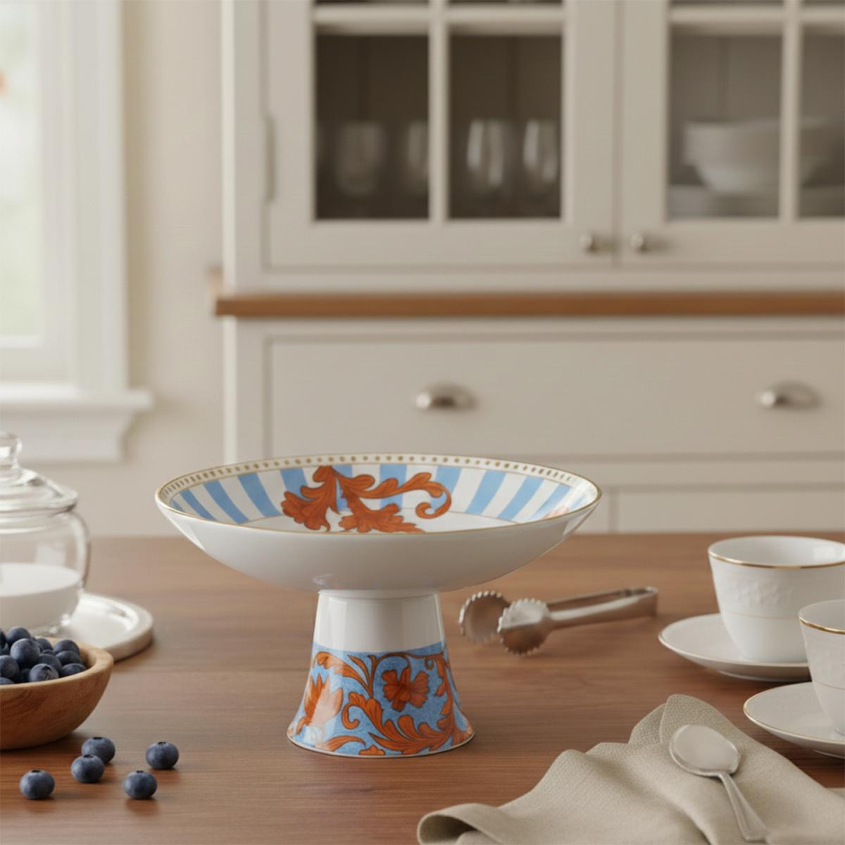 ZEFLORA Bone Ayaklı Sunum Kasesi, klasik Osmanlı motiflerini modern bir formla birleştirerek ikramlarınıza eşsiz bir estetik katar. Porselenin (Bone China) pürüzsüz ve lüks dokusu üzerinde yükselen bu özel parça, soft mavi çizgisel desenleri ve kontrast oluşturan kiremit rengi floral motifleriyle sofranızın en dikkat çekici detaylarından biri olmaya adaydır. Kase kenarındaki ince altın yaldız detayları, tasarımı lüks bir dokunuşla tamamlar.
