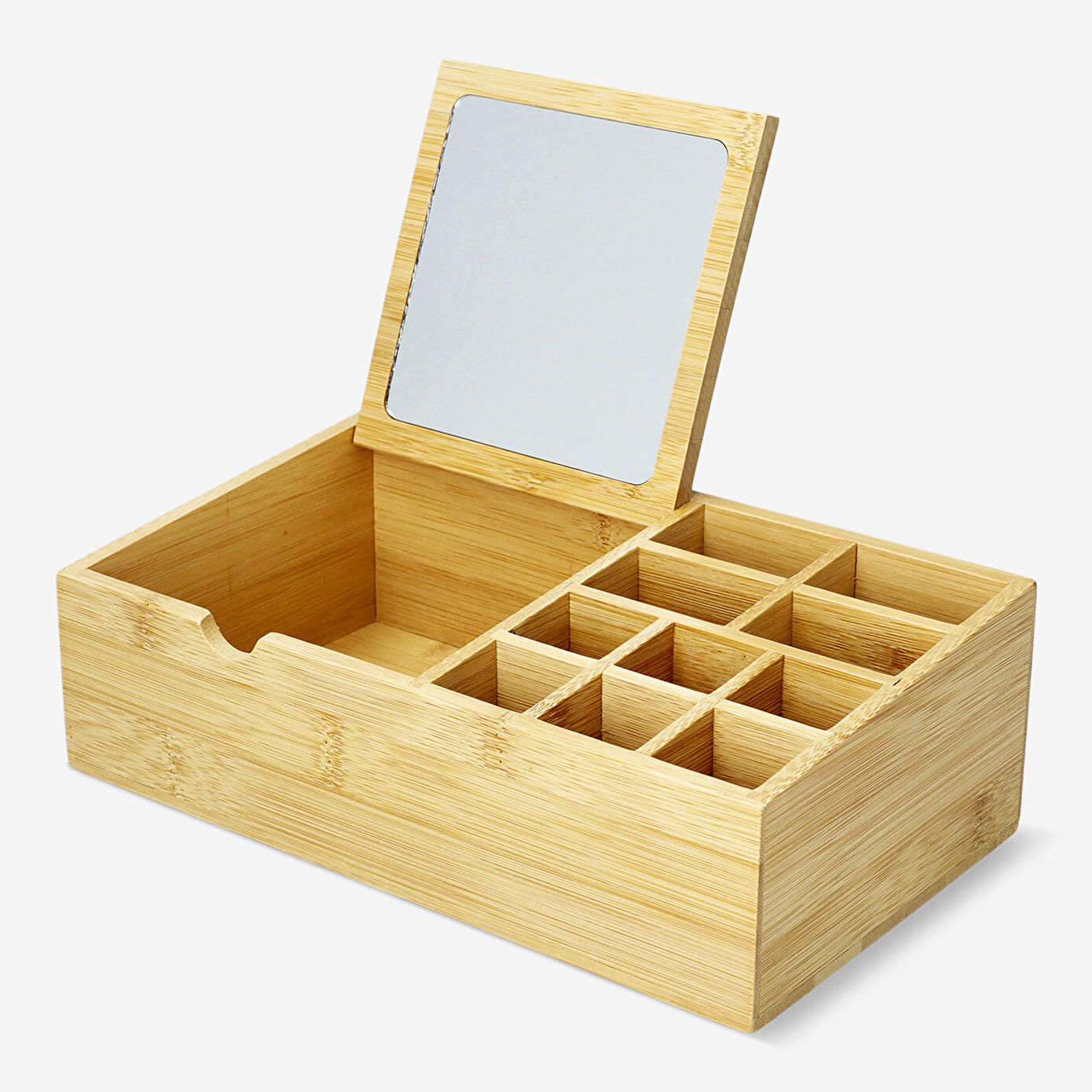 Aynalı Ahşap Makyaj Malzemesi Düzenleyici, hem şık hem de işlevsel bir depolama çözümü sunarak güzellik malzemelerinizi düzenli ve ulaşılabilir tutmanıza olanak tanır. Doğal bambu malzemeden üretilen bu düzenleyici, hem dayanıklı hem de çevre dostu bir seçenektir. Çoklu bölmeleri sayesinde makyaj malzemeleri, takılar ve güzellik ürünleri için geniş bir depolama alanı sağlar.