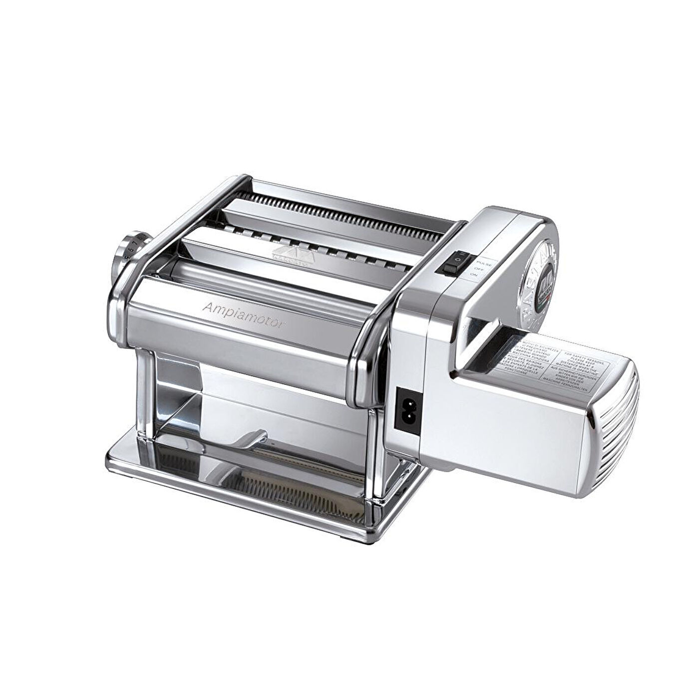 AMPİA MOTOR ELEKTRİKLİ MAKARNA MAKİNESİ: Taze makarnayı rahatlıkla hazırlamayı sevenlerin makinesi! Bu makinenin makaraları, makarnanın lezzetini artırmak ve baharatlara kolayca bağlanmasını sağlayacak yapıdadır. Makaralar, makarna hamurunun gözenekli bir yapıya sahip olması için gözle görülemeyecek kadar küçük pürüzlü bir yapıya sahiptir.