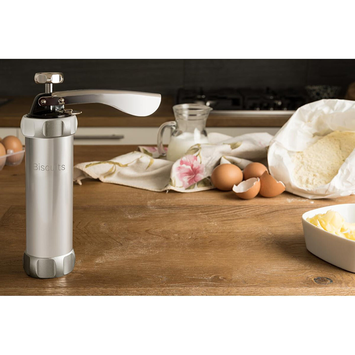 Biscuits, bir fırın tepsisinin tamamını dilediğiniz gibi süsleyebileceğiniz 20 farklı şekil ve 2 boyuttaki kurabiyelerle dakikalar içinde doldurabileceğiniz bir bisküvi/kurabiye yapma makinesidir.