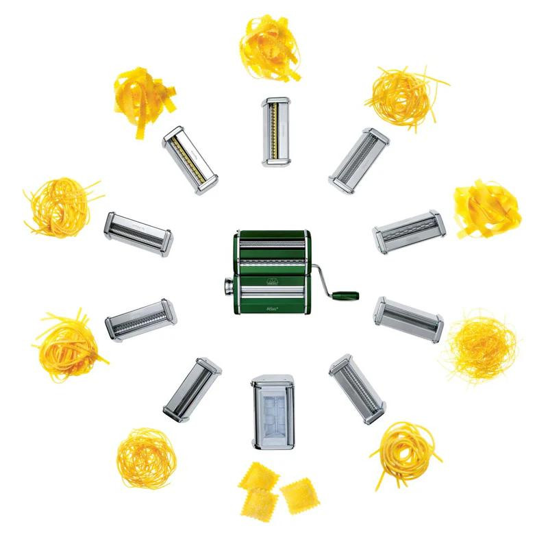 Kompakt tasarımı sayesinde tek bir aletle dört çeşit makarna yapabilirsiniz: lazanya, fettucine, tagliolini ve spagetti. Ayrıca 10 farklı ekstra aksesuar takılabilmektedirMakinenin malzemesi yüksek kaliteli krom çeliktir ve İtalya'da özenle işlenmiş ve monte edilmiştir.Her bir parça, ürünün zarafetini artırmak, sağlamlığını ve basitliğini korumak için titizlikle tasarlanmıştır.Makinenin ürettiği hamur genişliği 15 cm'dir ve 10 farklı kalınlık ayarı (4,8 mm-0,60 mm) sunar. Böylece istediğiniz kalınlıkta makarna yapabilirsiniz.Atlas + özel kesicisi sayesinde incelik seviyesi 4 olan hamuru Spagetti , 7 olan hamuru ise Tagliolini olarak keser