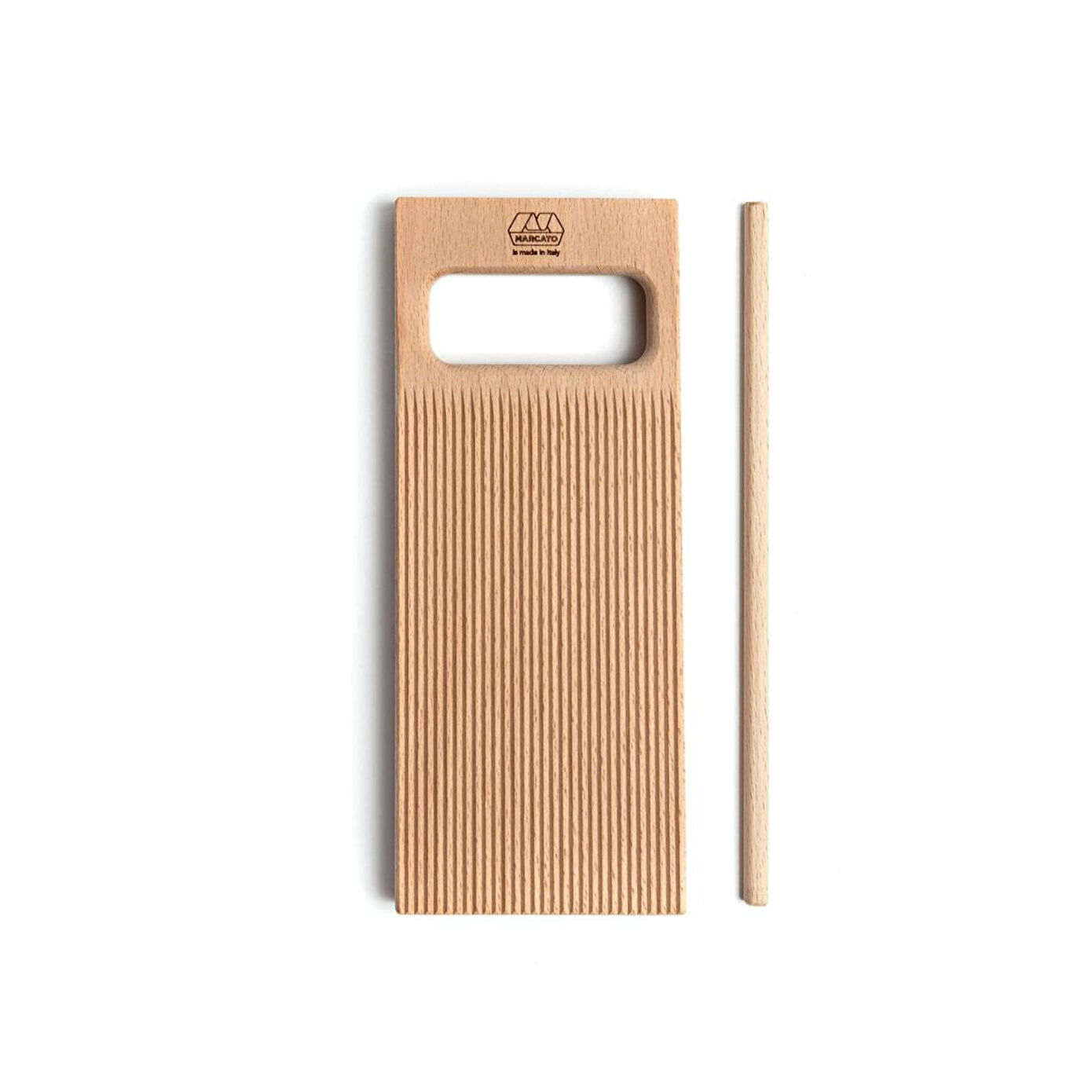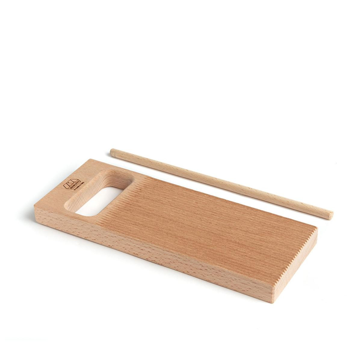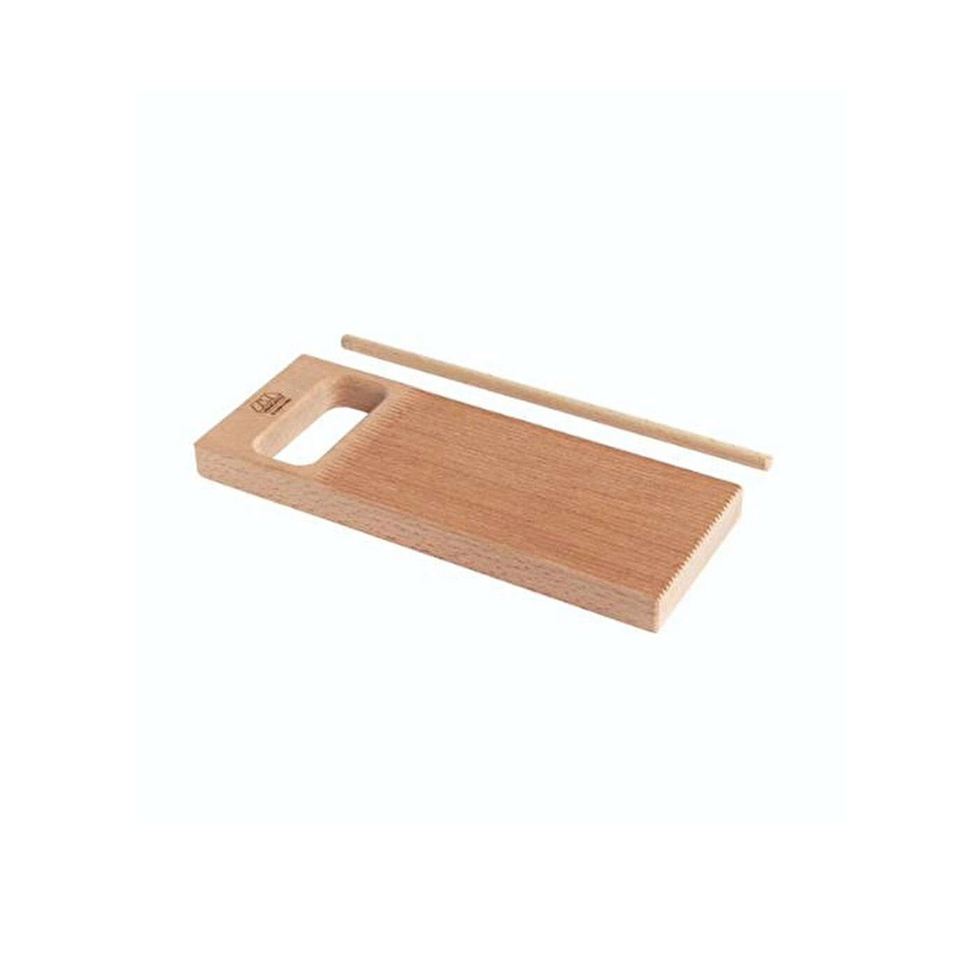 Ahşap gnocchi tahtası ve yine ahşaptan yapılmış eşlik eden çubuk sayesinde garganelli, cavatelli ve her türlü gnocchiyi kolayca hazırlayabilirsiniz.