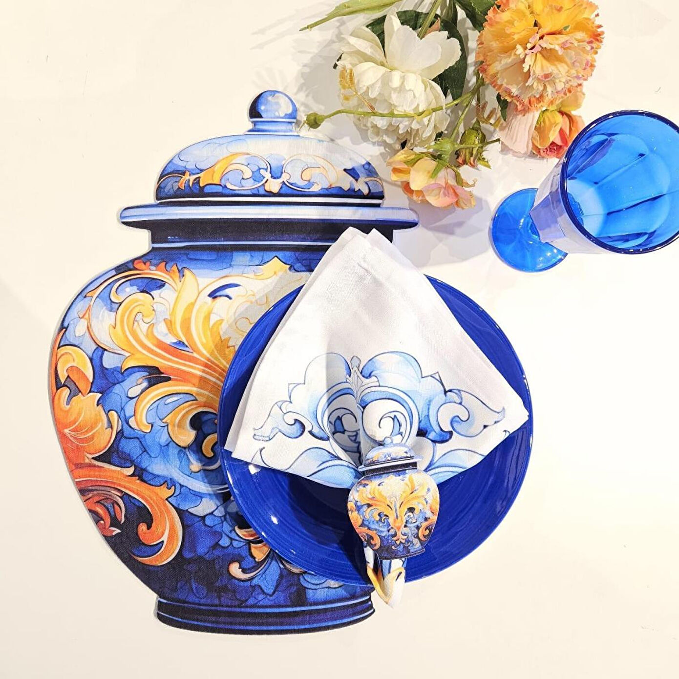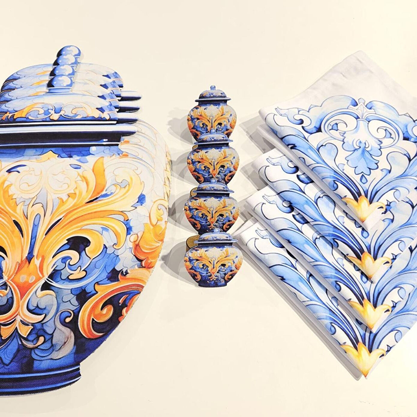 Maxxdeco farkı ile sizler için tasarladığımız setimiz 4 adet supla-amerikan servis, 4 adet peçete halkası, 4 adet servis peçetesi olacak şekilde toplam 12 parçadan oluşmaktadır. Leke tutmaz kumaş özelliğine sahiptir ve 30 derecede çamaşır makinesinde yıkanabilir. Tabak altlığı olarak kullandığımız suplalarımız ve peçete halkalarımıza desenin modeline göre özel kesim yapılmıştır.Supla 33x30 cm,Peçete halkası 7x6 cm,Peçete 40x40 cm ölçüsündedir.