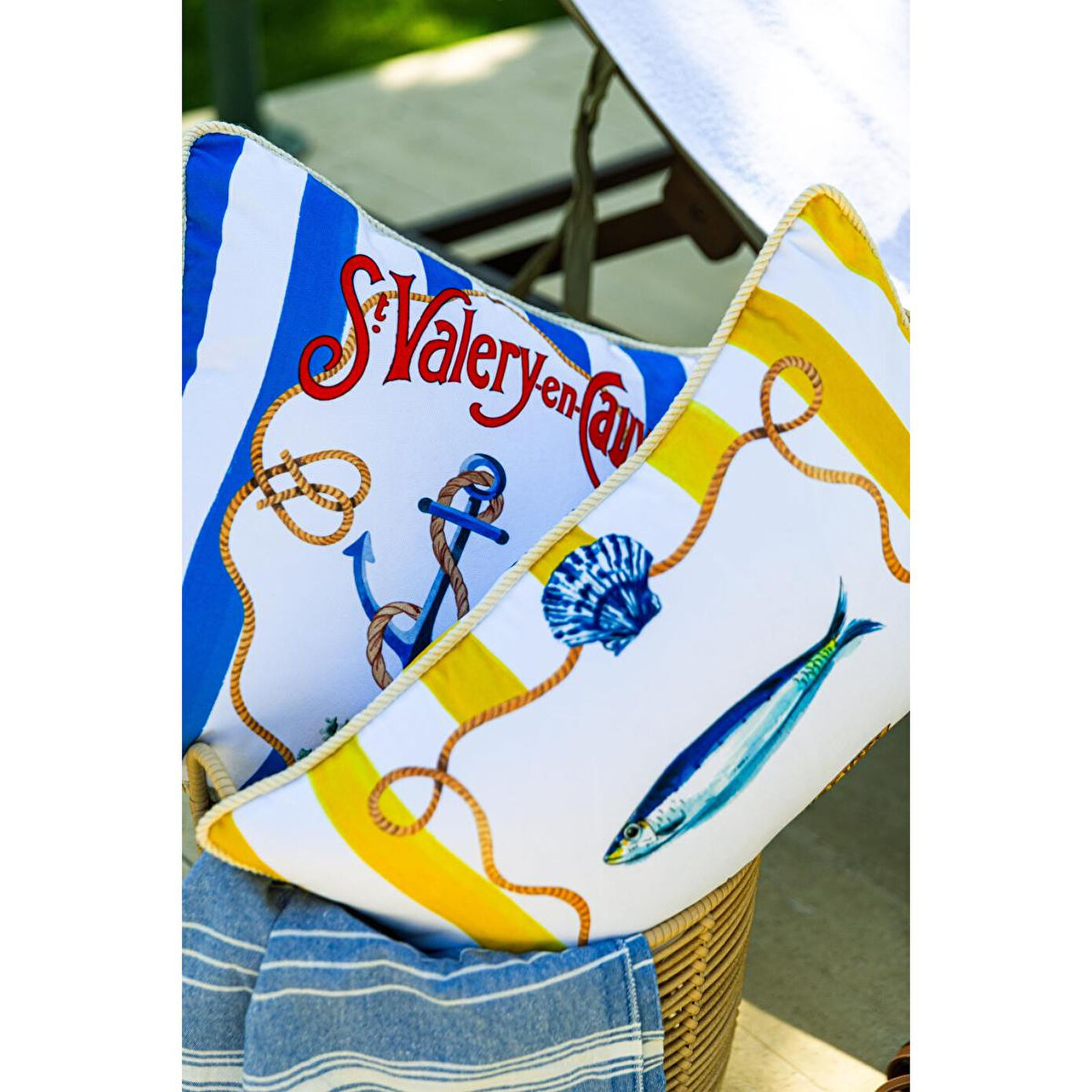 Kumaşımız özel bir işlem görmüş polyesterdir. Leke Tutmaz ve 30 derecede yıkanabilir. Ürünümüz çift taraf baskılıdır. Gizli fermuar kullanılmıştır. Kırlentimizde özel hazırlanmış halat biye detayı kullanılmıştır.