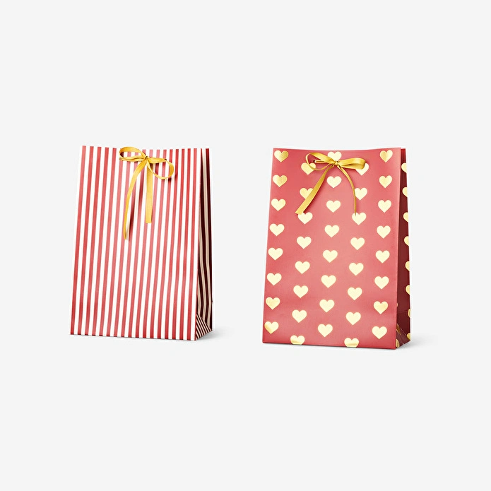 Kalpli Kırmızı 2’li Hediye Paketi, zarif tasarımı ve sevimli kalp detaylarıyla özel günlerinizi daha anlamlı hale getirir. 10 x 30 x 21 cm boyutlarındaki bu iki pop-up çanta, kolayca açılarak orta ve büyük boy hediyeler için geniş bir alan sunar. Kartondan üretilen çantalar, içeriği güvenle taşırken aynı zamanda altın renkli kurdeleleriyle göz alıcı bir görünüm yaratır.