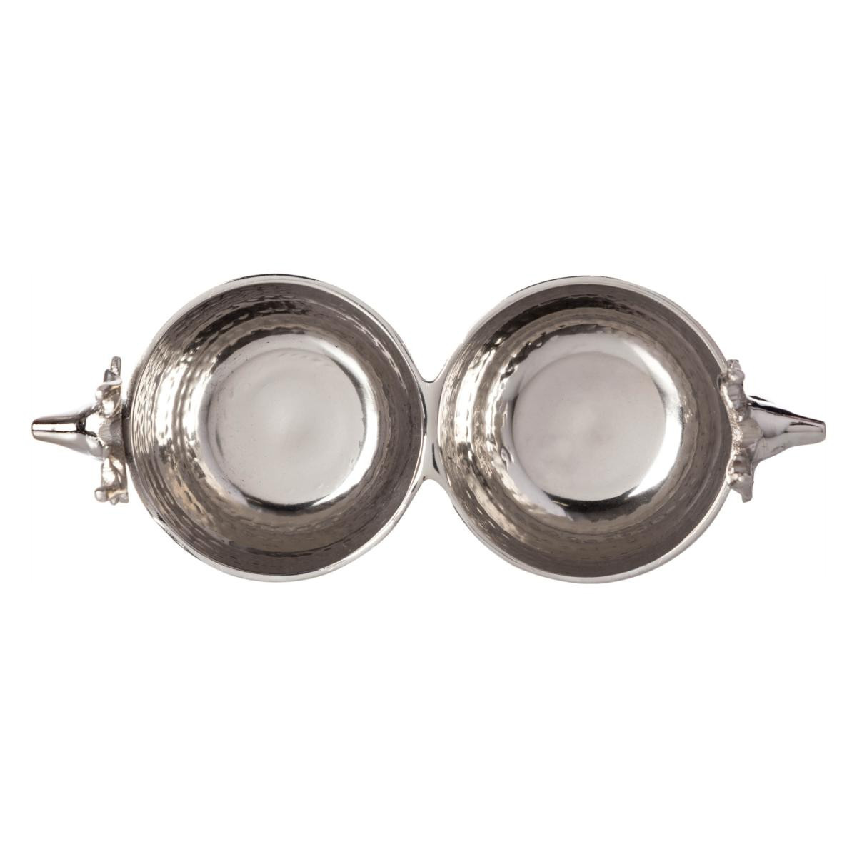 Parlak metalik yüzeyi, üzerindeki çekiçlenmiş doku deseniyle birleşerek ışığı zarif bir şekilde yansıtır ve dinamik bir görünüm sunar. Tasarımın merkezinde yer alan geyik figürleri, ürüne özgün bir karakter kazandırırken, iki ayrı kase bölümü küçük takılar, anahtarlar veya dekoratif objeler için fonksiyonel bir sergileme alanı yaratır. Konsol, orta sehpa veya çalışma masası üzerinde tek başına bile güçlü bir dekoratif etki bırakır.