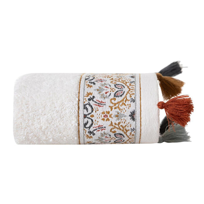 Carmen püsküllü el havlusu, banyonuza estetik ve konforu bir arada sunar. Yumuşak dokusu sayesinde her kullanımda doğal bir rahatlık hissi verir. Beyazın sade ve temiz görünümü, turuncu, kahverengi, gri ve krem gibi sıcak renklerle tamamlanarak banyonuza samimi bir atmosfer kazandırır. Etnik ve dekoratif detaylarıyla öne çıkan Carmen el havlusu, evini dekore etmeyi seven ve banyo tekstilinde şıklığı arayanlar için uygun bir seçenektir.