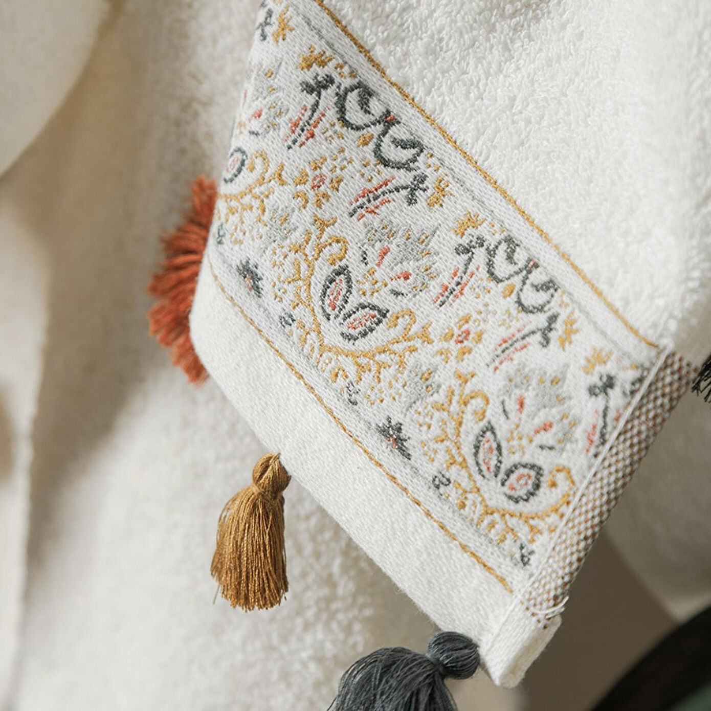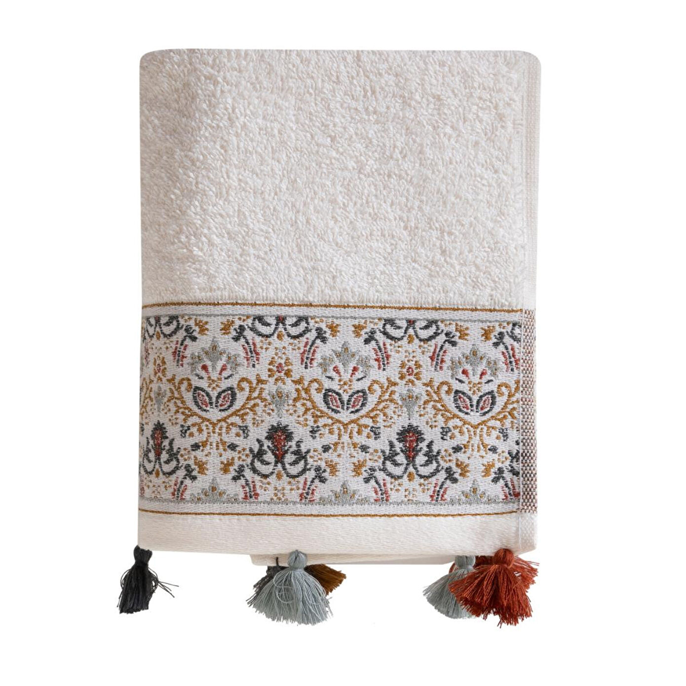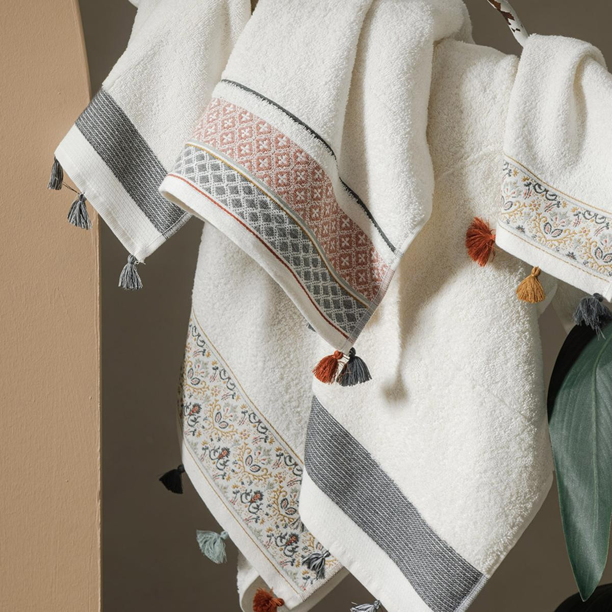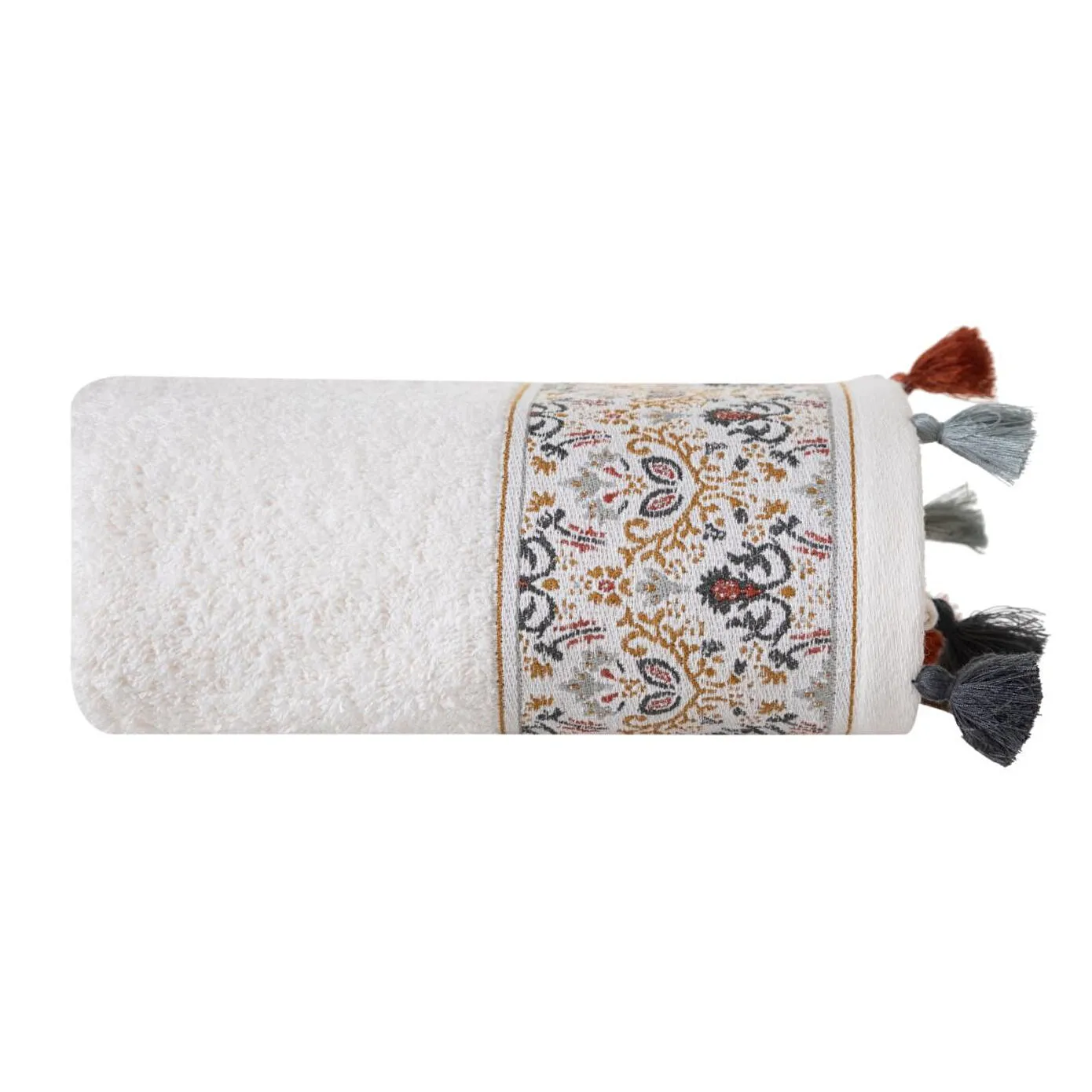Desenli bordür detayı ve tasarımını tamamlayan şık püskülleriyle işlevselliğinin yanı sıra banyonuz için dekoratif bir unsur olarak da öne çıkar. Kalın ve dolgun görünümü, ürünün kalitesini ve dayanıklılığını yansıtır. Bu havlu, hem misafirleriniz için şık bir detay hem de kişisel bakım rutininiz için konforlu bir tamamlayıcıdır.