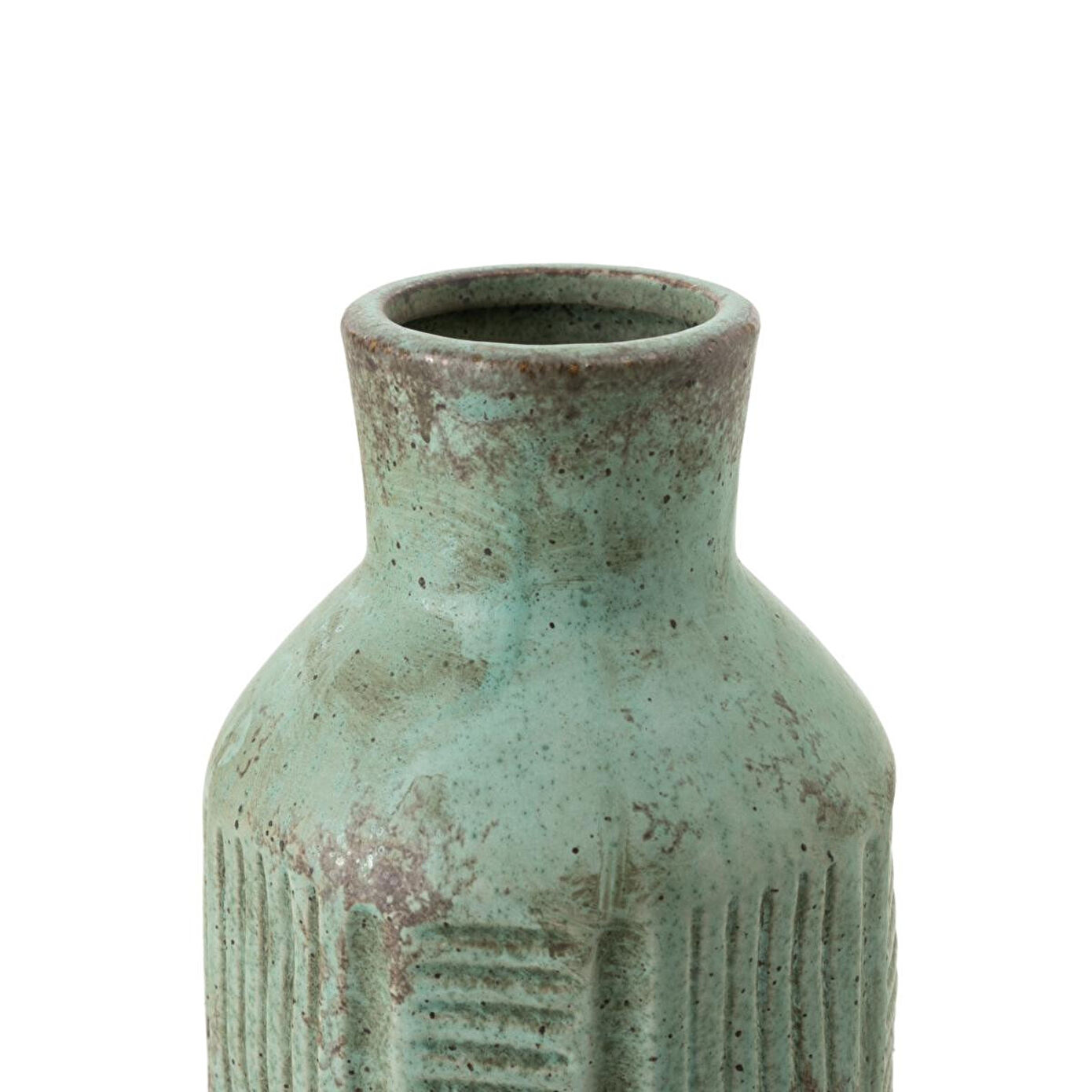 Silindirik forma sahip olan bu modern vazo, yüzeyindeki dikey çizgili deseni ve mat, pürüzlü dokusuyla dikkat çeker. Bu dokusal yapı, ürüne eskitilmiş ve otantik bir görünüm kazandırır. Dar ağız detayı, tek bir dal çiçek, pampas otu veya kuru bitki aranjmanları için zarif bir sunum imkanı tanır. İster salon aksesuarı olarak konsol üzerinde, ister yatak odasında bir şifonyer üstünde kullanılsın, tek başına dekoratif bir unsur olarak öne çıkar.