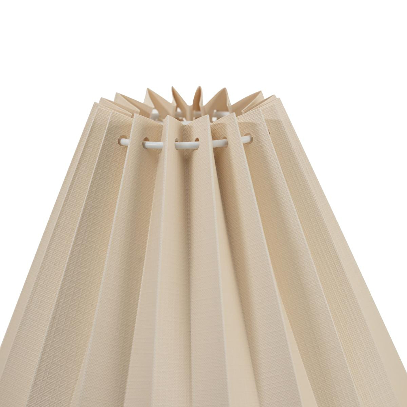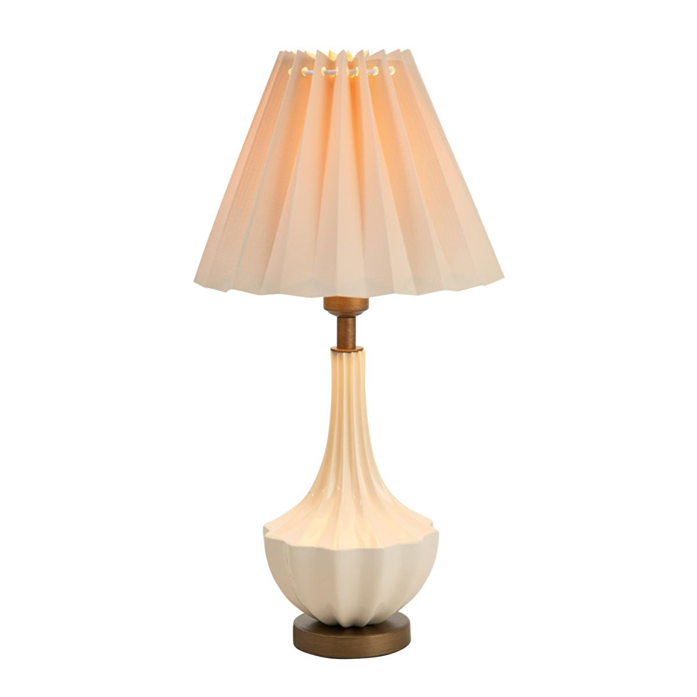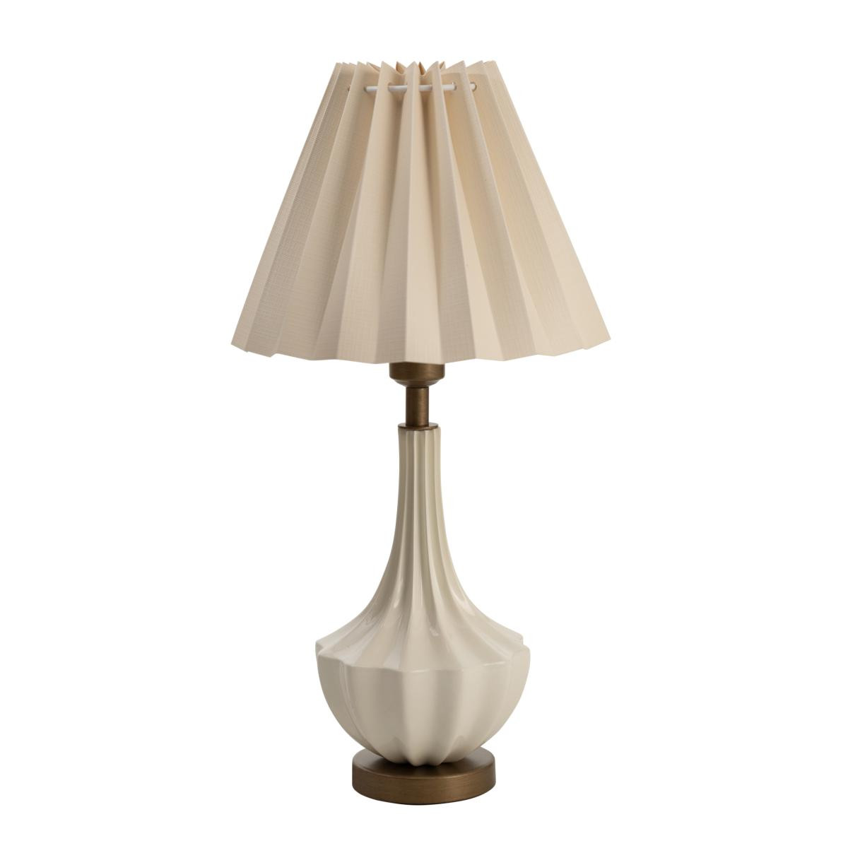 Vazo formundaki pürüzsüz gövdesi, dokulu ve pliseli başlığıyla estetik bir uyum oluşturur. Bu pliseli detay, ışık kapalıyken bile tasarıma hareket katar. Bronz renkli taban ve bağlantı noktaları, abajurun krem rengi tonuyla şık bir kontrast yaratarak tasarımı tamamlar. Bu dekoratif aydınlatma, okuma köşeleri, yatak odası komodinleri veya salon konsolları üzerinde hem işlevsel bir ışık kaynağı hem de dekoratif bir obje olarak konumlandırılabilir. Başlığından süzülen yumuşak ve davetkar ışık, mekanın atmosferini zenginleştirir.