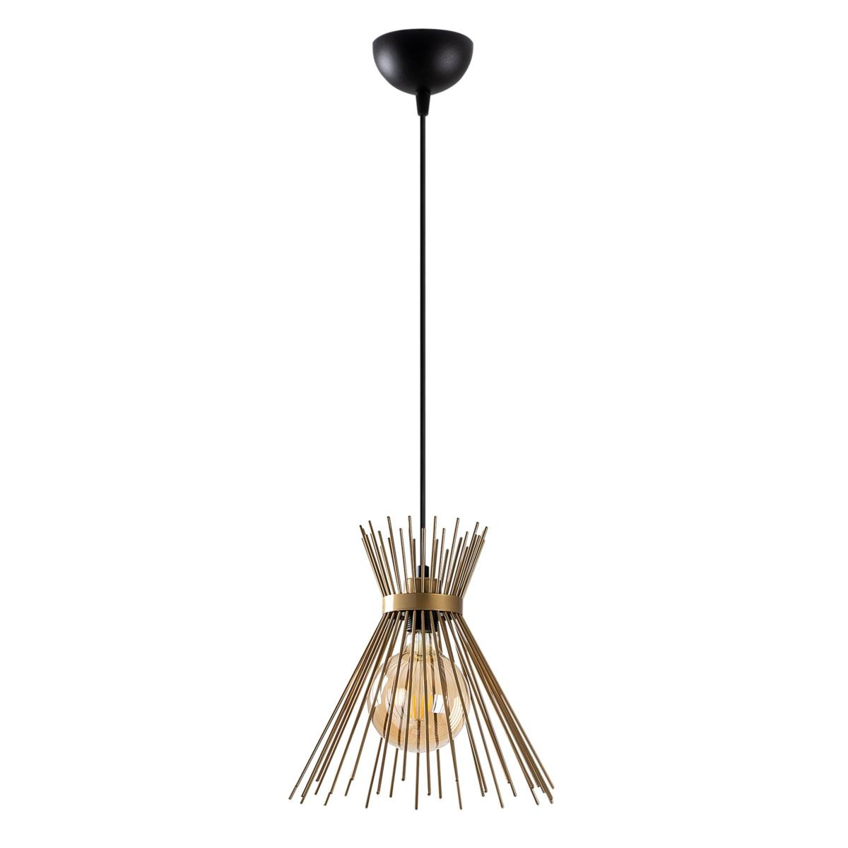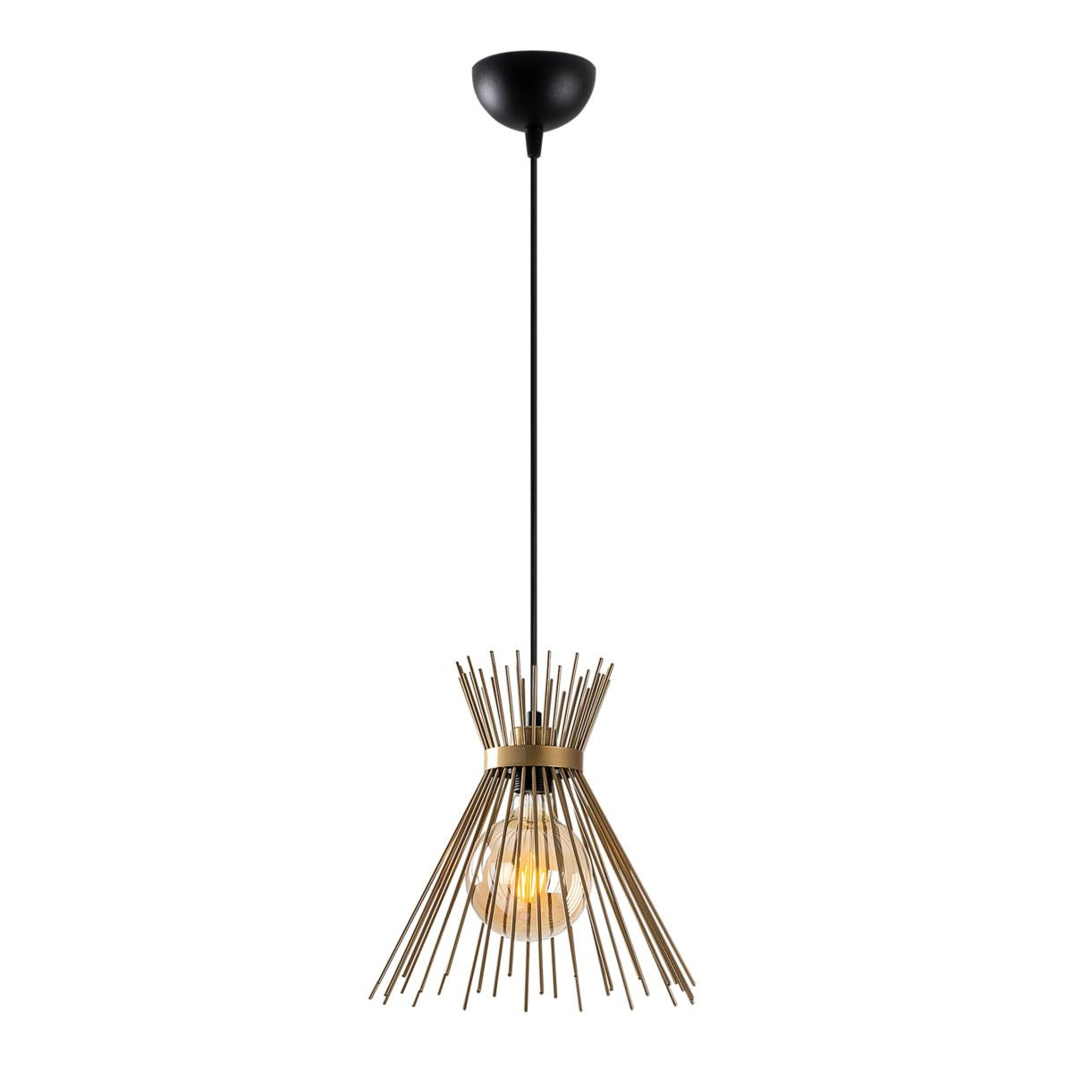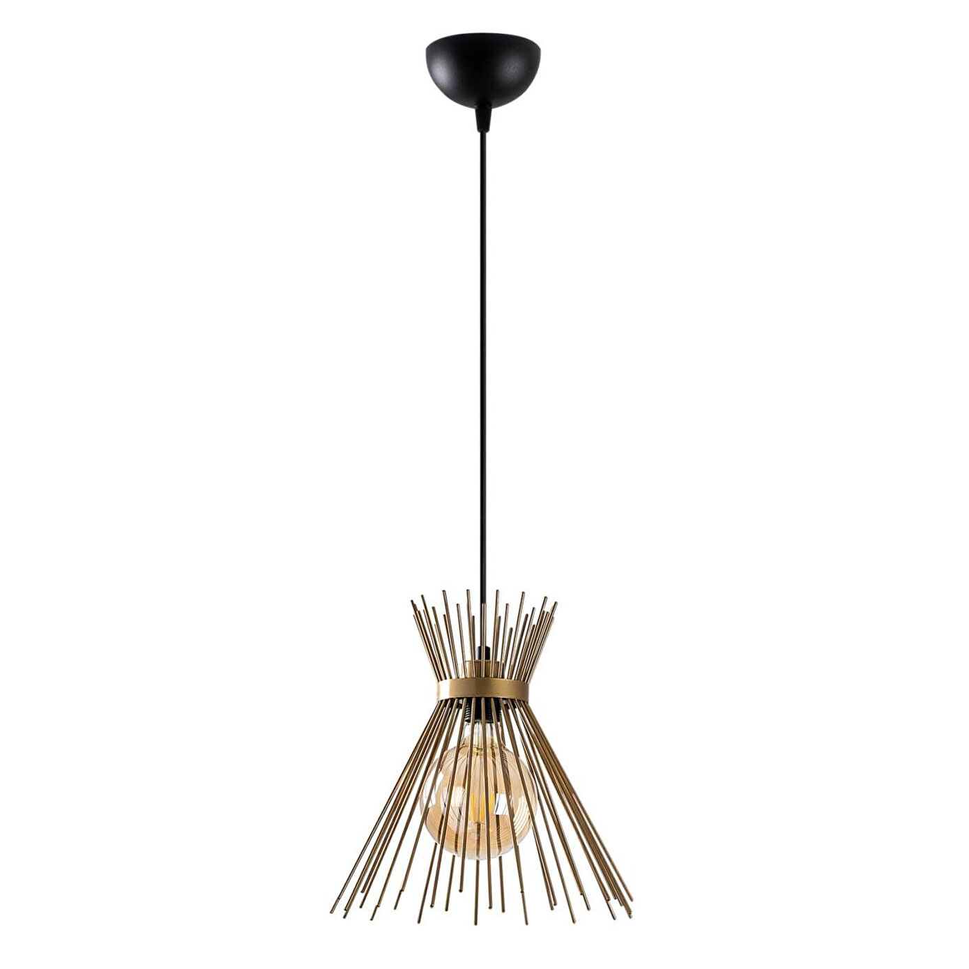 Altın renginin sıcaklığını modern bir formla birleştiren bu sarkıt, asıldığı mekana anında daha lüks ve dinamik bir hava katar. Modern ve ışıltılı bir dokunuş olarak ön plana çıkan bu sarkıt, sade ancak dikkat çekici tasarımıyla hem tek başına bir köşeyi aydınlatmak hem de yemek masası üzerinde set halinde kullanmak için uygundur. Minimalist hatları, metalik parlaklığıyla dengelenmiştir.%100 Metal