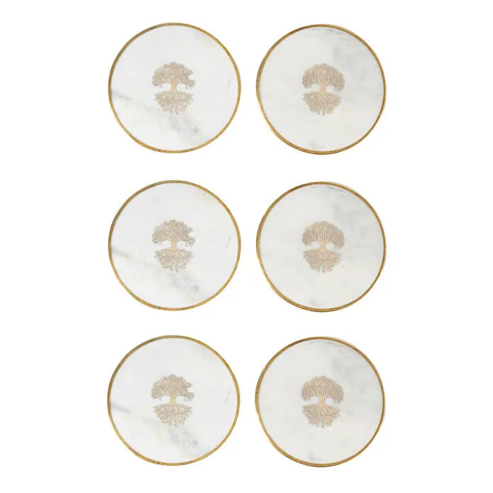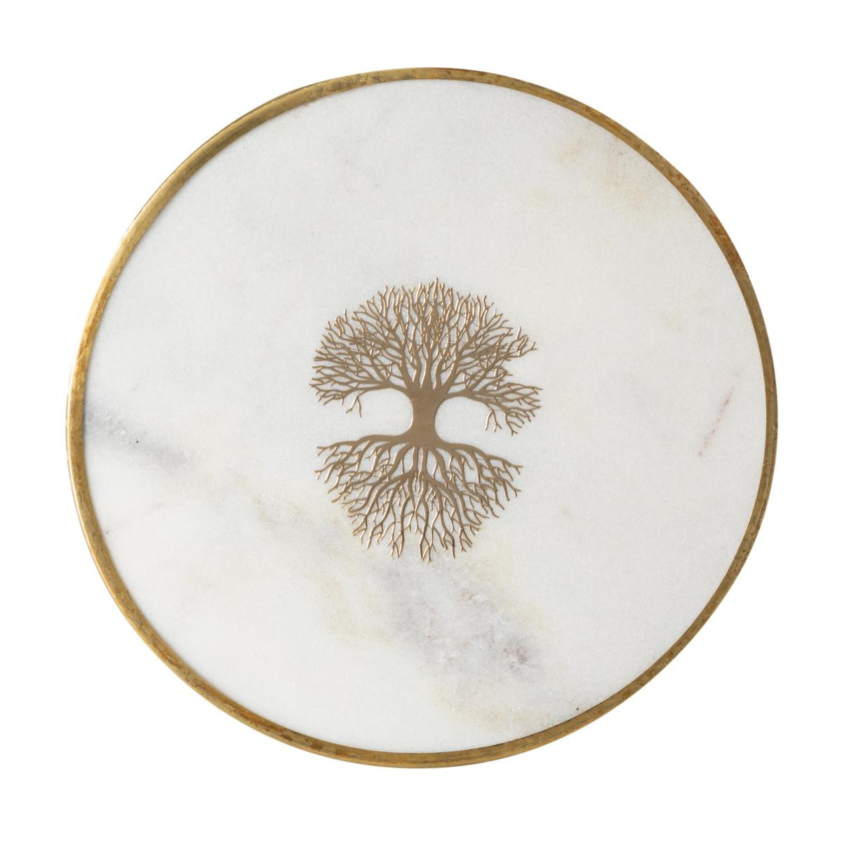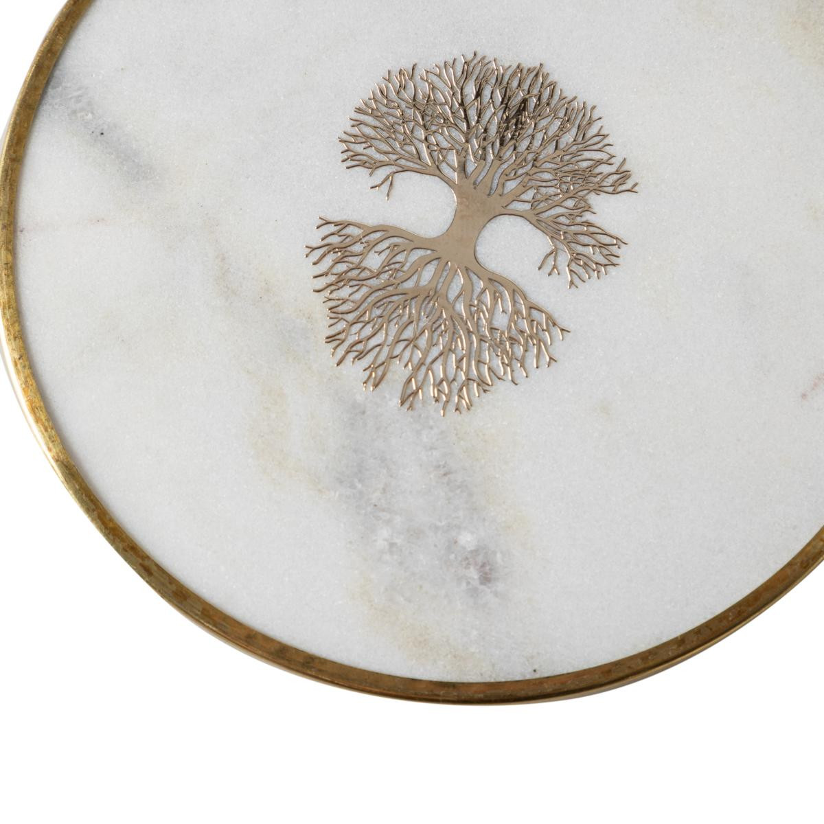 Pürüzsüz yüzeyindeki zarif mermer deseni, parlak çerçevesiyle birleşerek dikkat çekici bir görünüm sunar. Tasarımın merkezinde yer alan stilize ağaç figürü detayı ise ürüne özgün bir karakter kazandırır. Bu altlıkları, içecekleriniz için bir koruyucu olarak kullanabileceğiniz gibi, mum veya takı gibi küçük eşyalarınız için estetik bir sergileme alanı olarak da değerlendirebilirsiniz. Sehpa, konsol veya yemek masası üzerinde dekoratif bir unsur olarak dikkat çeker. Minimalist ve sofistike duruşuyla farklı dekorasyon stillerine uyum sağlar.