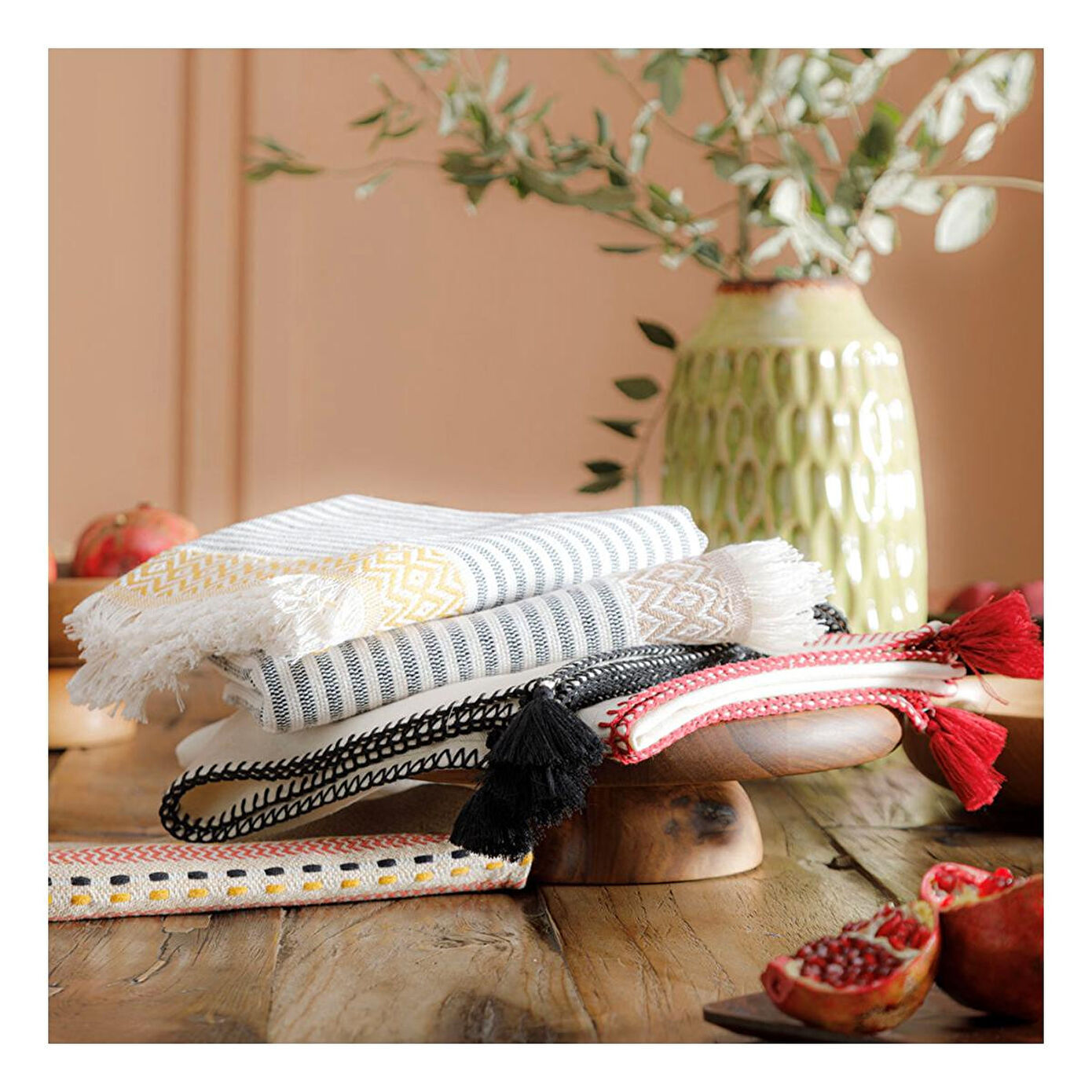 Oradea püsküllü runner, fonksiyonellik ve estetiği bir araya getirerek masa dekorasyonunda fark yaratmak isteyenler için ideal bir aksesuardır. Zarif tasarımıyla hem günlük sofralarda hem de özel buluşmalarda masanıza şıklık kazandırır. Modern ve sade çizgileriyle evinizin dekorasyonuna uyum sağlar ve her ortamda doğal bir şıklık sunar.