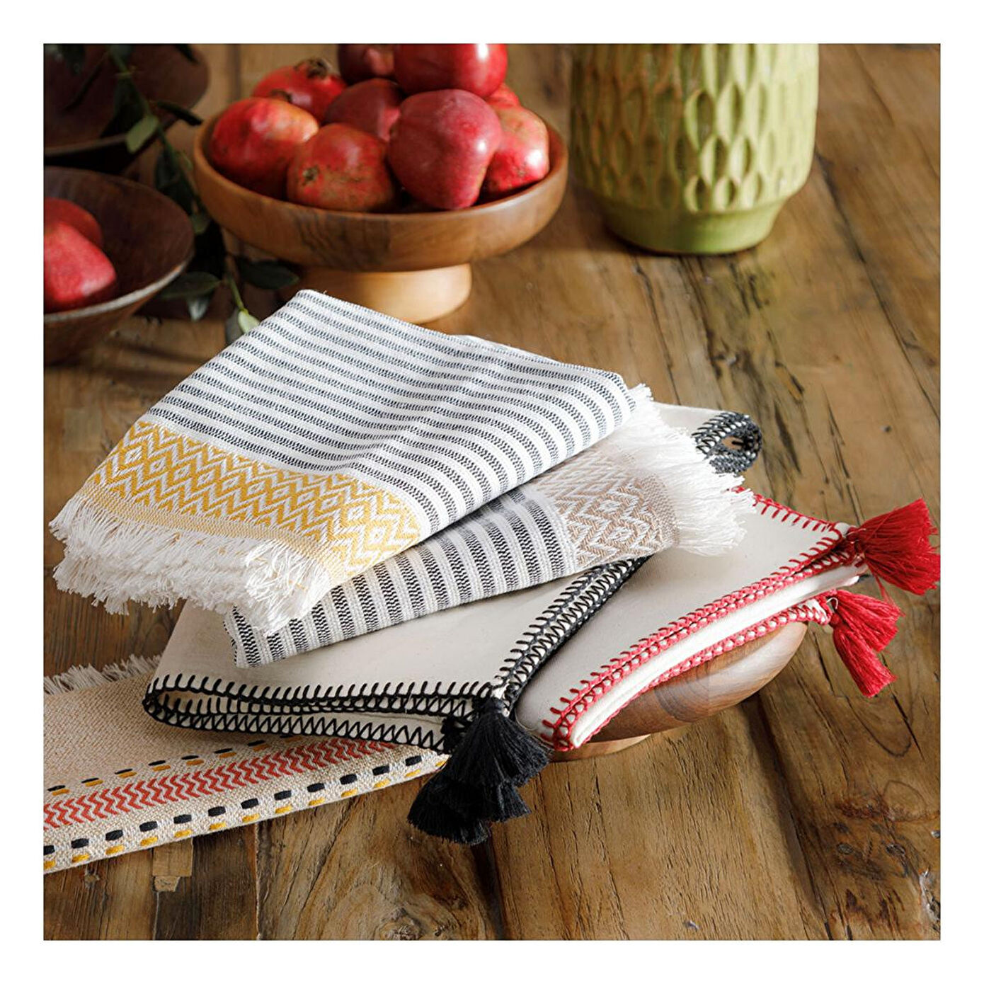 Bu runner modeli, ev dekorasyonuna özen gösteren ve detaylarda şıklık arayan kullanıcılar için uygundur. Salon, yemek odası ya da mutfak masasında rahatlıkla kullanılabilir. Özellikle modern ve şehirli yaşam tarzını benimseyenler için, masa düzeninde hem kullanışlı hem de estetik bir çözüm sunar. Püskül ve dikiş detayları, sade bir masada bile odak noktası oluşturur. Doğal ışık altında kumaşın hafif kırışık dokusu ve yumuşaklığı daha da belirginleşerek ortama sıcaklık ve samimiyet katar.