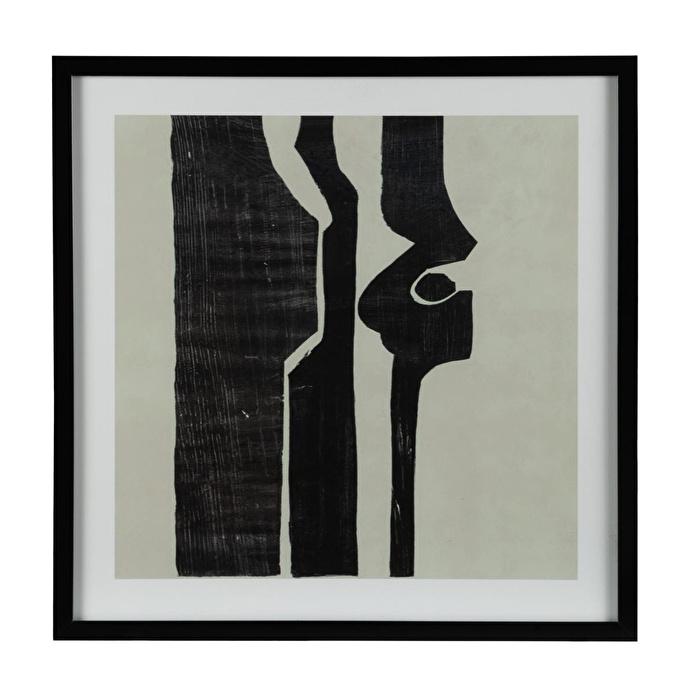 Koyu tonlardaki pürüzsüz çerçevesi, eserin merkezindeki kontrast yaratan soyut desenleri güçlü bir şekilde vurgular. Desen ile çerçeve arasında kullanılan paspartu detayı, kompozisyona görsel bir derinlik katarken, parlak cam yüzey ise tablonun mat dokusuyla dikkat çekici bir denge oluşturur. Bu tasarım, modern dekorasyon anlayışının hakim olduğu mekanlarda duvarlara sofistike bir karakter kazandırır. Minimalist bir salonda, şık bir çalışma odasında veya bir bekleme alanında dikkat çekici bir unsur olarak öne çıkar.