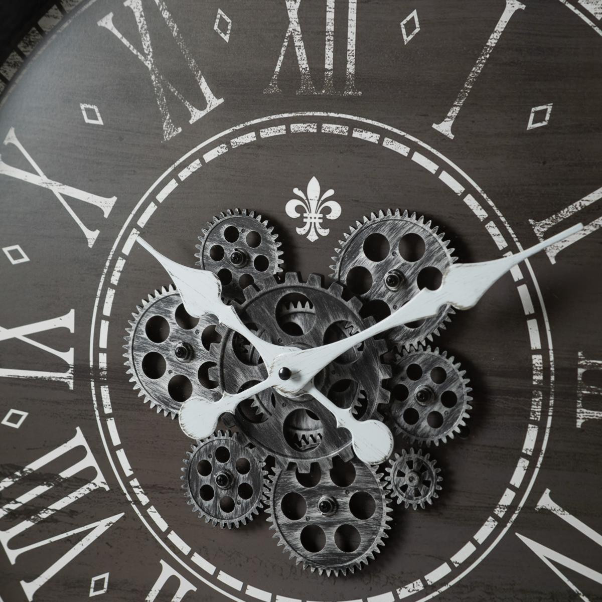 Saatin en belirgin özelliği olan merkezindeki dişli detayı, endüstriyel tarzı vurgularken, eskitilmiş yüzeyi ve büyük Romen rakamları tasarıma nostaljik bir derinlik katar. Ahşap görünümlü dokusu ve üst kısmında yer alan askı halkası detayı, saatin vintage karakterini tamamlar. Rodaclak duvar saati, özellikle endüstriyel ve eklektik dekorasyon stillerini benimseyen mekanlarda güçlü bir odak noktası oluşturur.