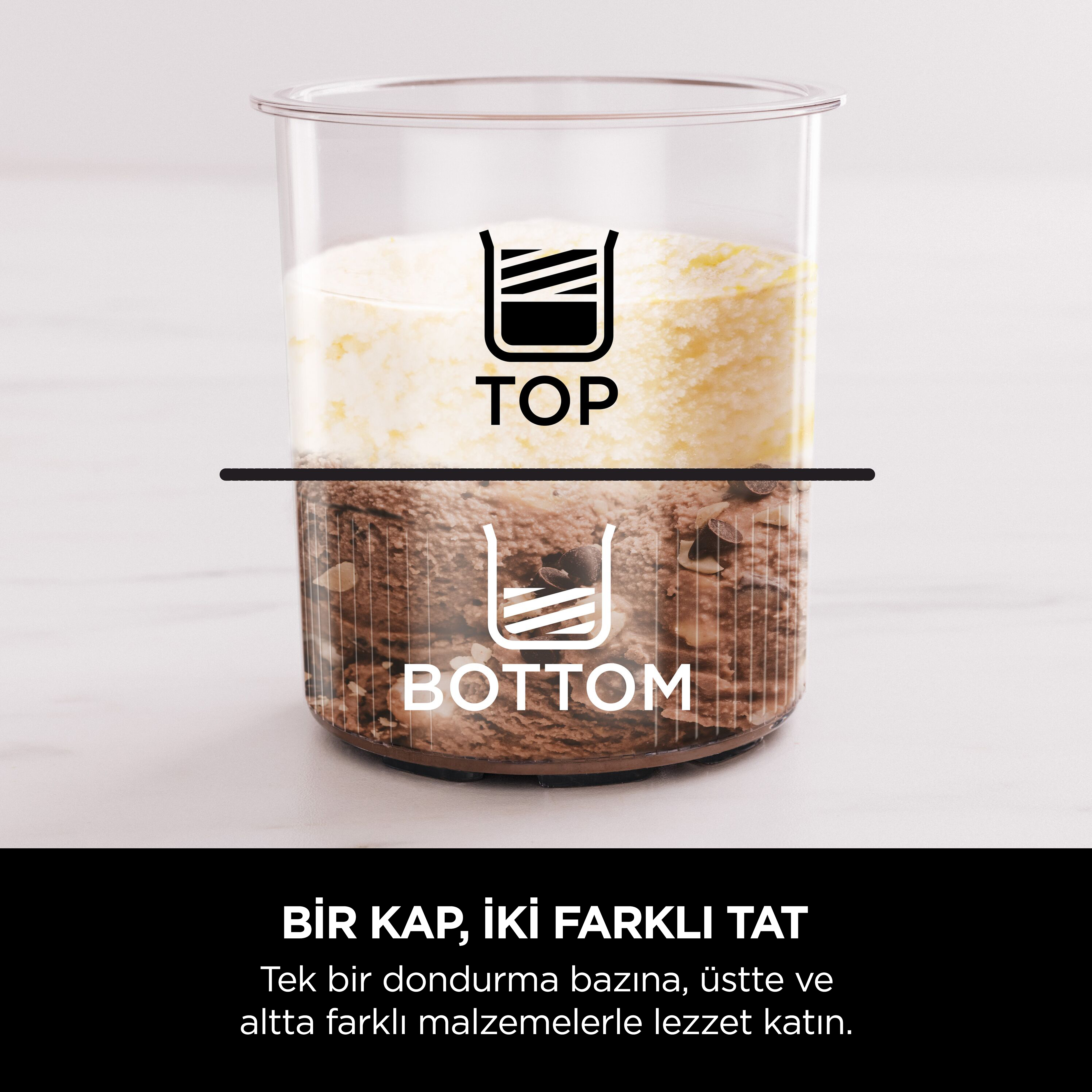 Top/Bottom/Full seçenekleri ile dilerseniz dondurulmuş bazınızın hepsini bir anda dondurma yapmak zorun kalmazsınız. Üst kısmını dondurma yapıp kalan kısmını aynı veya farklı programla dilediğiniz zaman tüketmek için sonra hazırlayabilirsiniz. Bu aynı zamanda tek kapta iki farklı çeşitte dondurma yapmanızı sağlar.