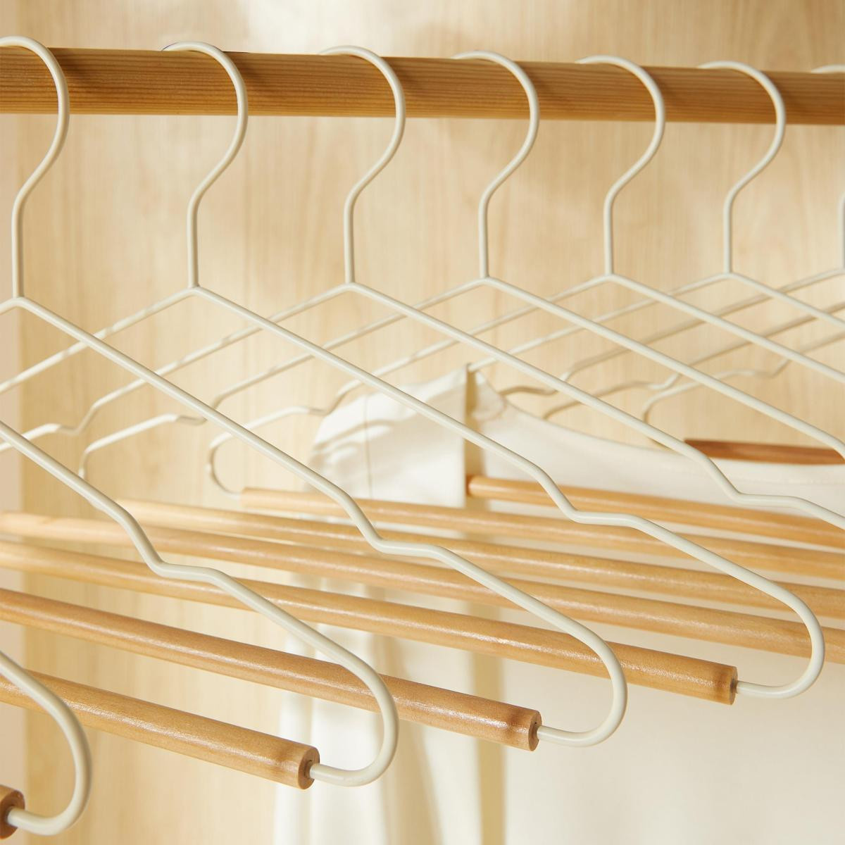 Ahşap destekli metal yapısı, kıyafetlerin düzenli durmasını sağlarken formunu korumaya yardımcı olur.