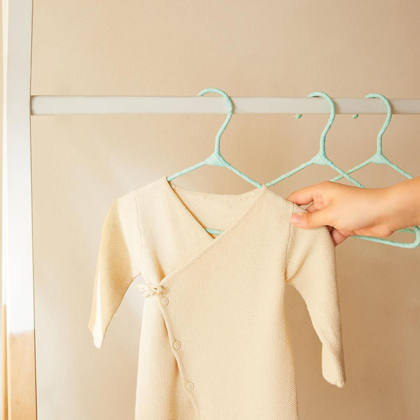 Bebek giysi askıları zarif kumaş kaplama detayıyla, kayma riskini en aza indirerek giysilerin kusursuzca yerinde kalmasını sağlar.