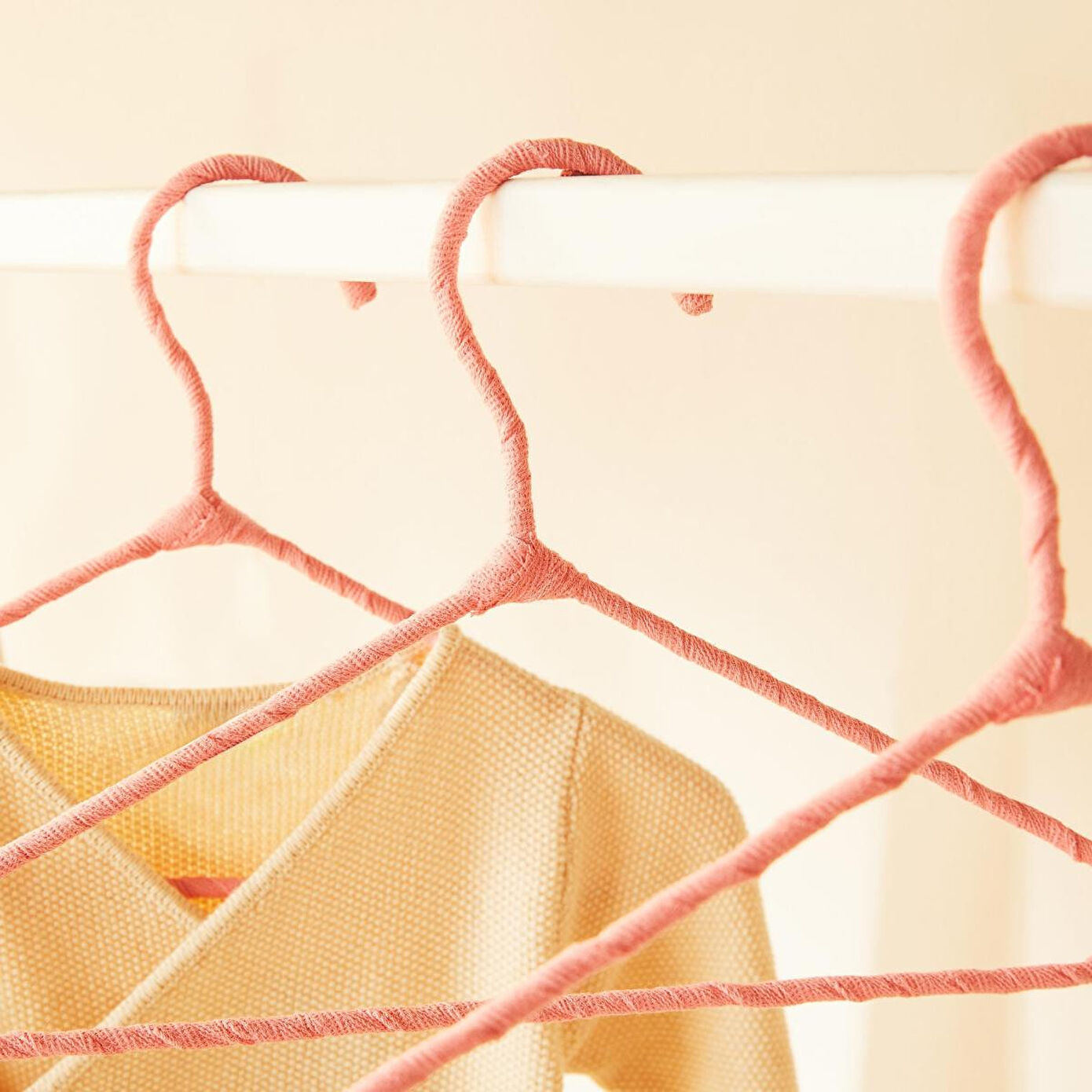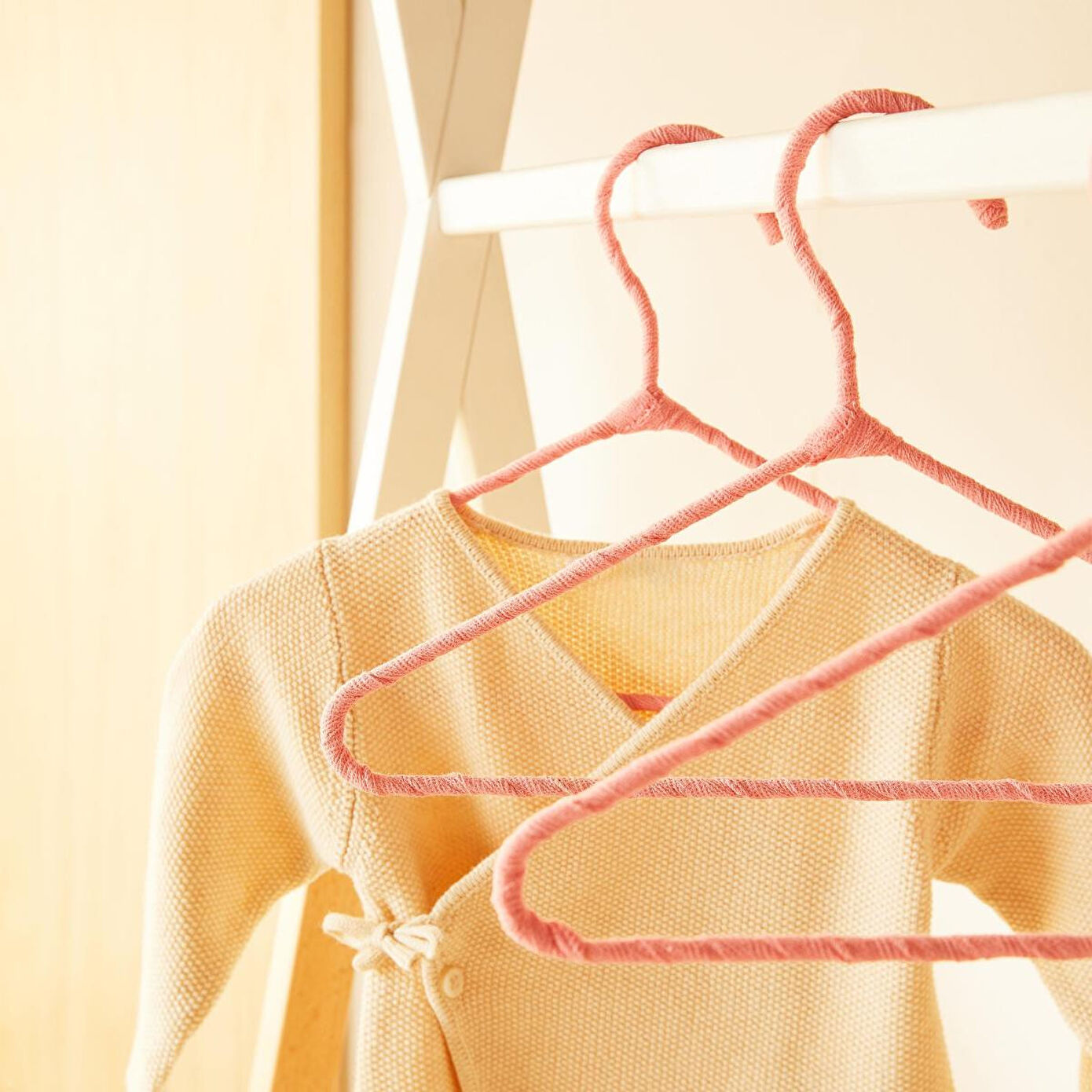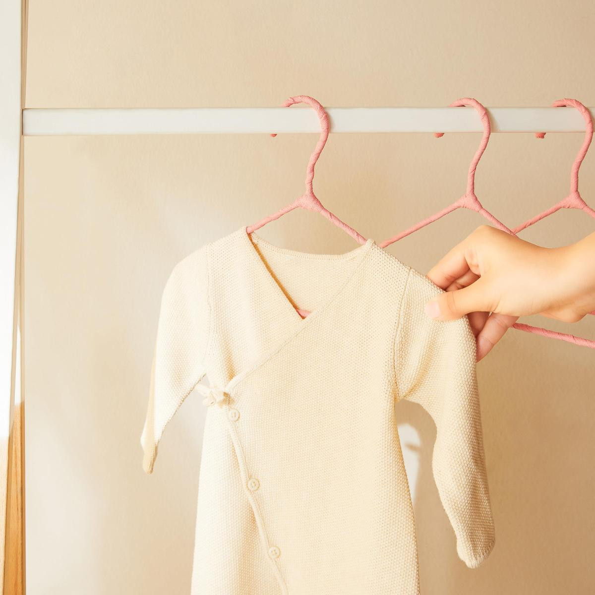 Bebek giysi askıları zarif kumaş kaplama detayıyla, kayma riskini en aza indirerek giysilerin kusursuzca yerinde kalmasını sağlar.