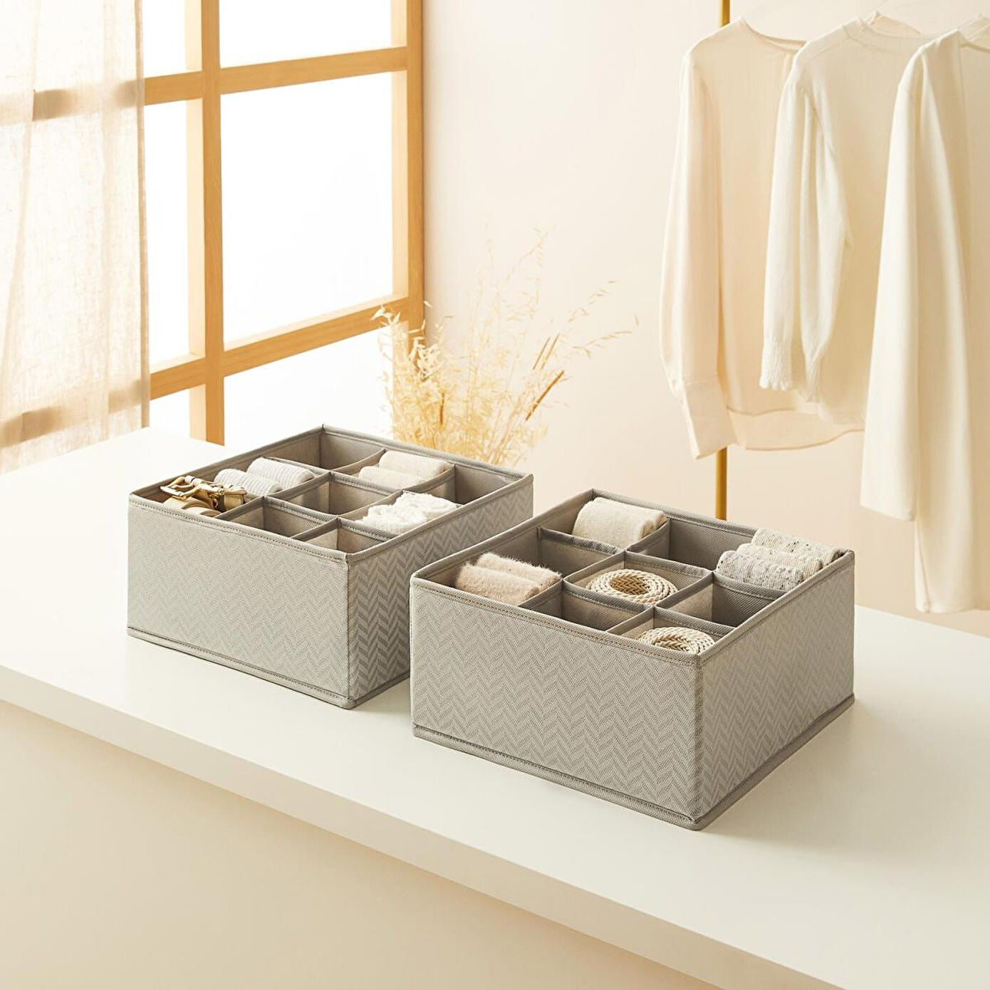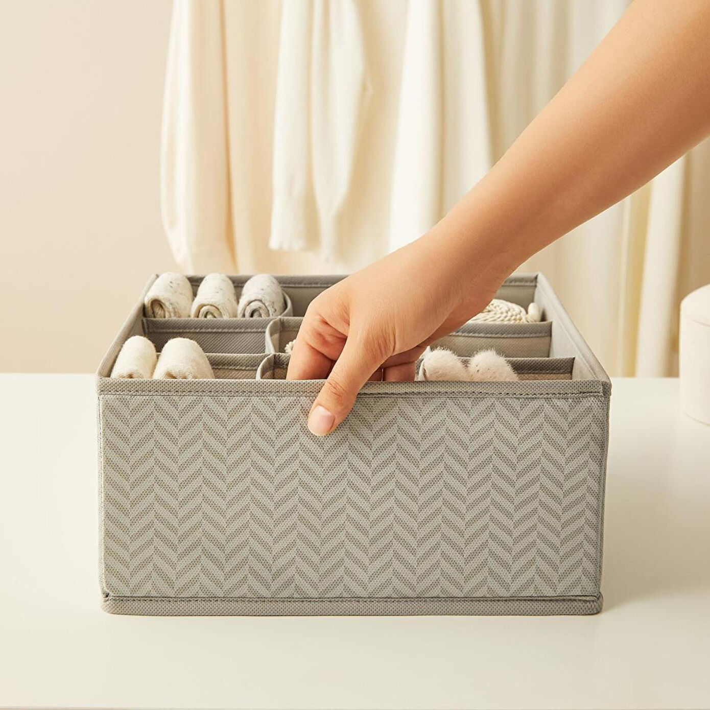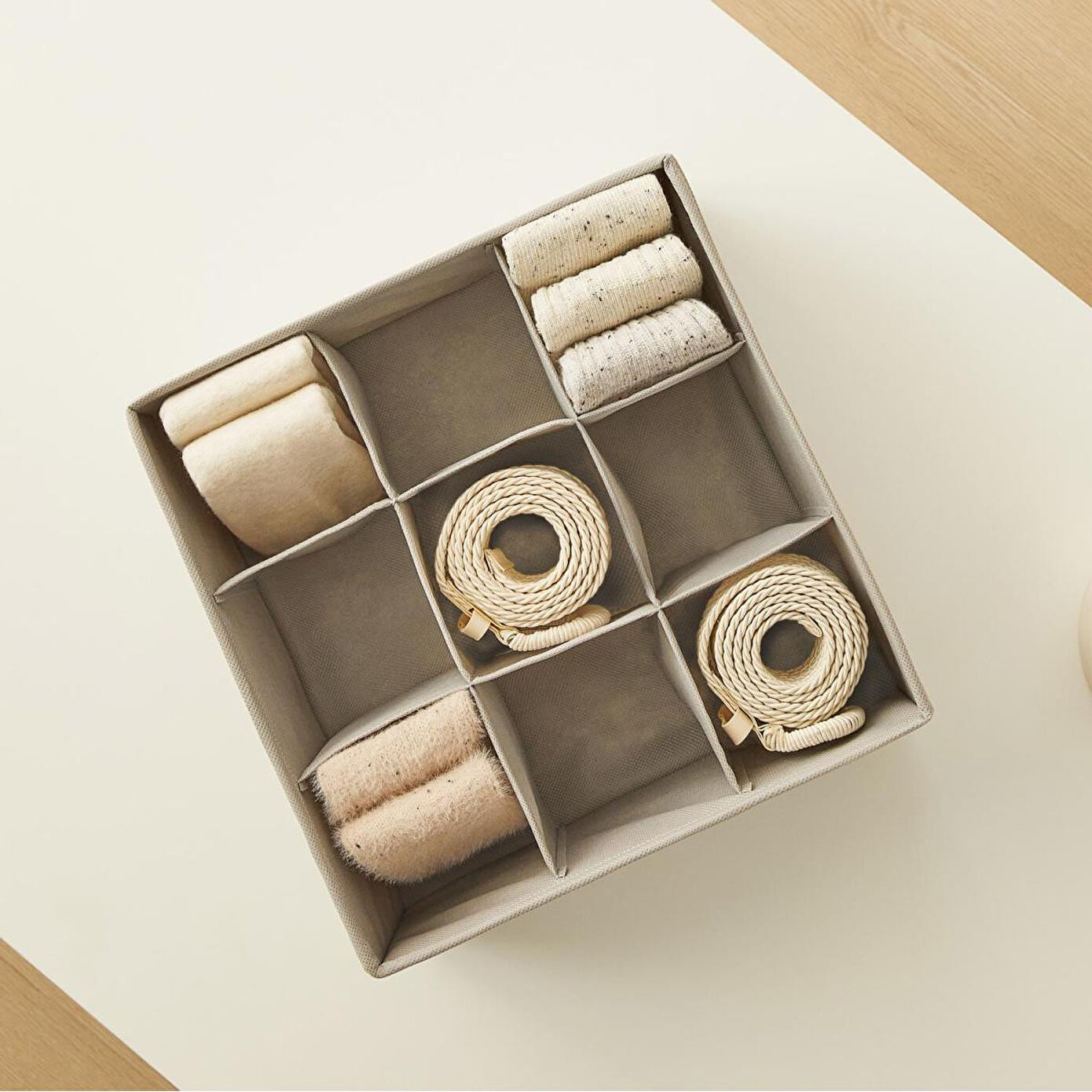 9 bölmeli çekmece içi düzenleyici kutu çekmecelerde bulunan çorap, iç çamaşırı, kravat, kemer, bebek eşyaları ve daha birçok ürünü kategorize ederek, kolayca erişilebilir hale getirir.