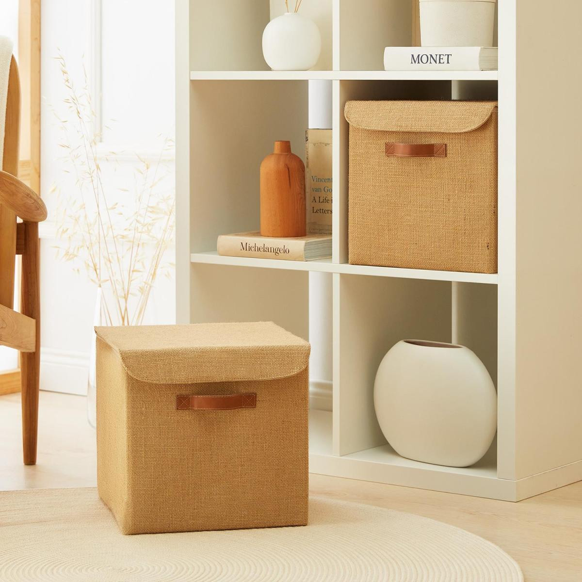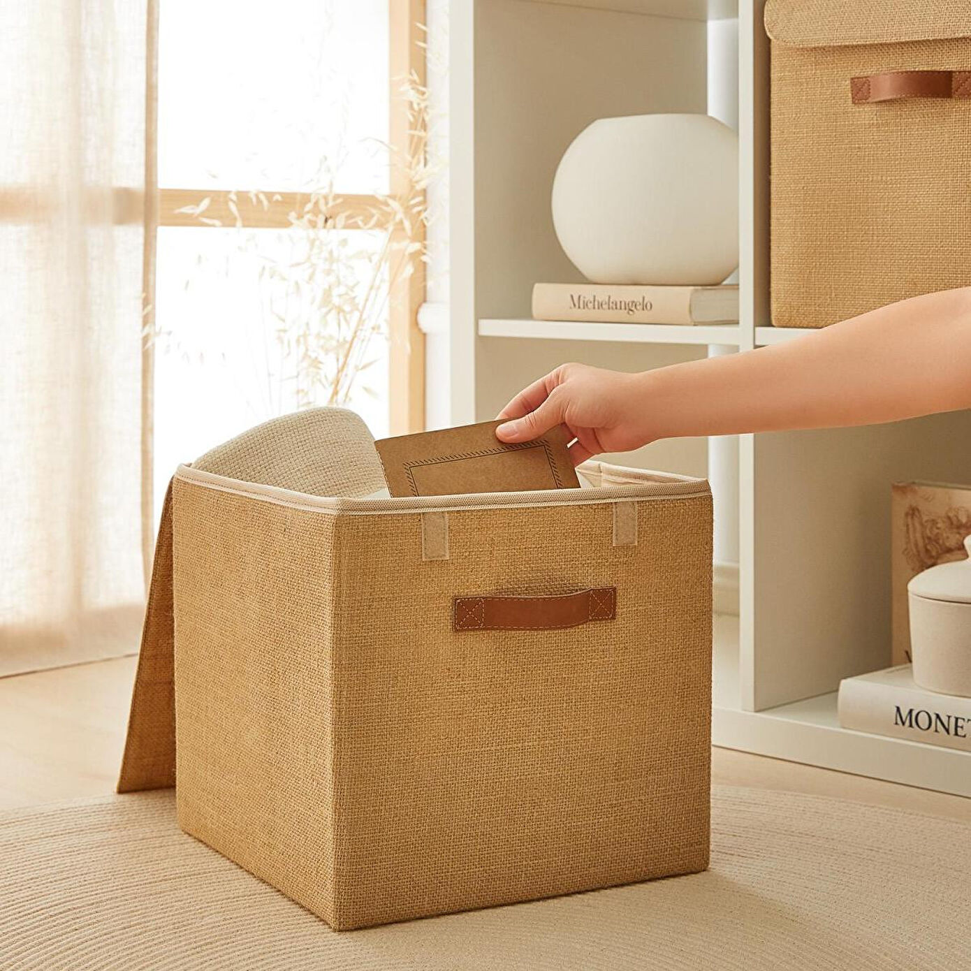 Ev ve ofiste, düzenli alan oluşturmanıza yardımcı olurken, aynı zamanda deri görünümlü kulp ve jüt kumaş yapısıyla bulunduğu ortama şıklık katar.