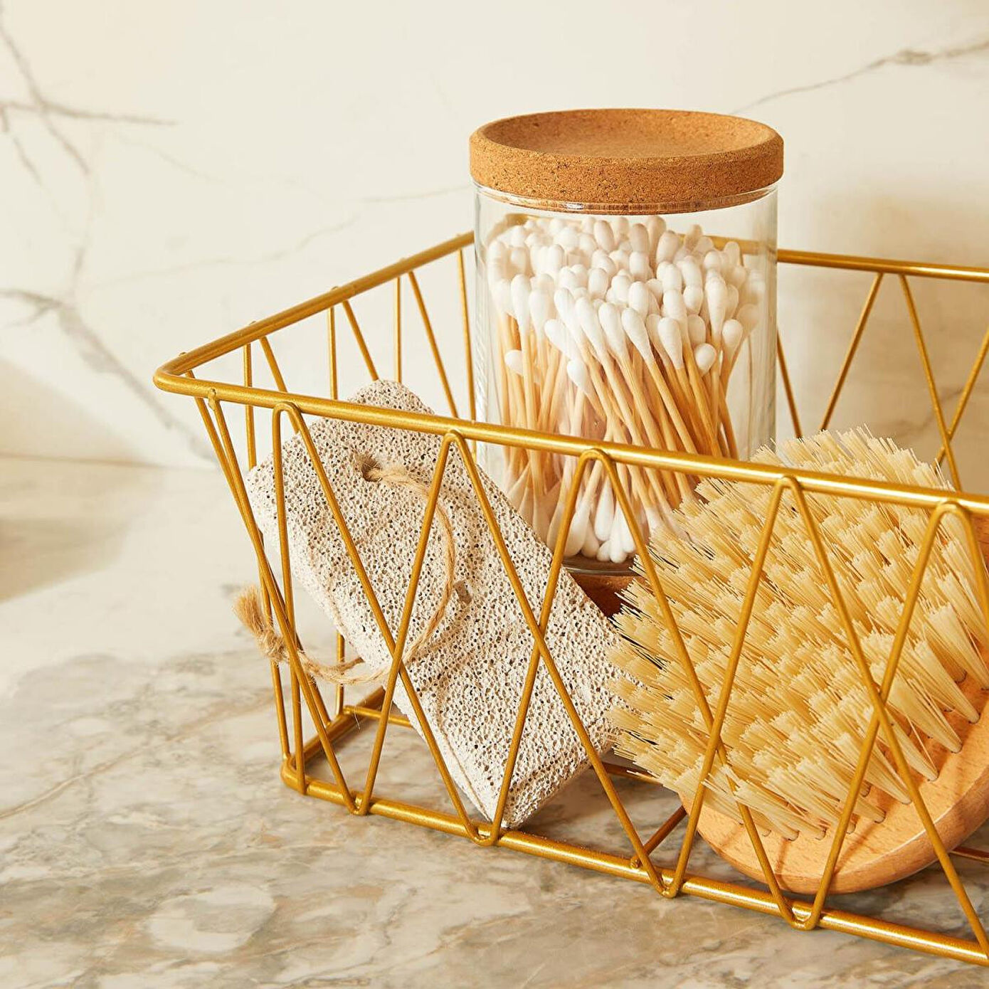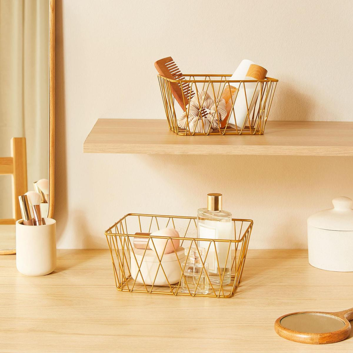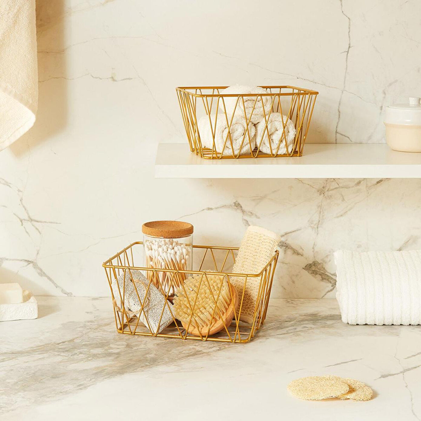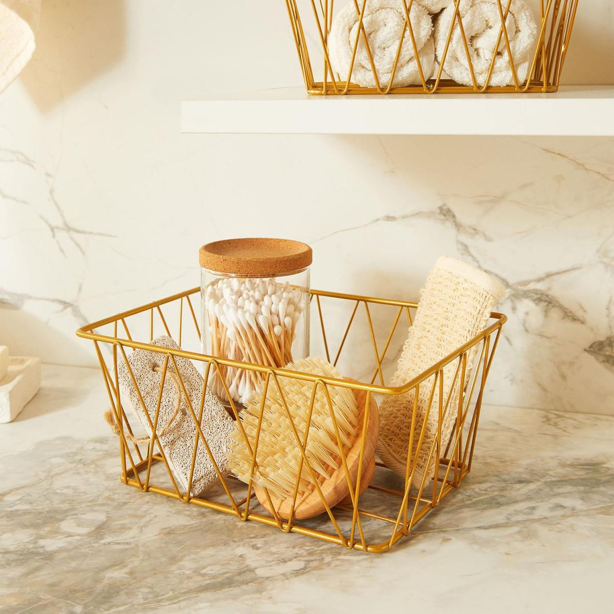 Banyolarda düzeni ve şıklığı bir arada sunan metal tel sepet, altın rengiyle modern ve zarif bir görünüm sunarken; sabun, şampuan, havlu, gibi günlük ürünleri kolayca organize etmenize yardımcı olur. Ayrıca makyaj alanlarında; makyaj fırçalarını, pamuk, krem, tarak ve diğer saç ürünlerini düzenli tutmanıza yardımcı olur.