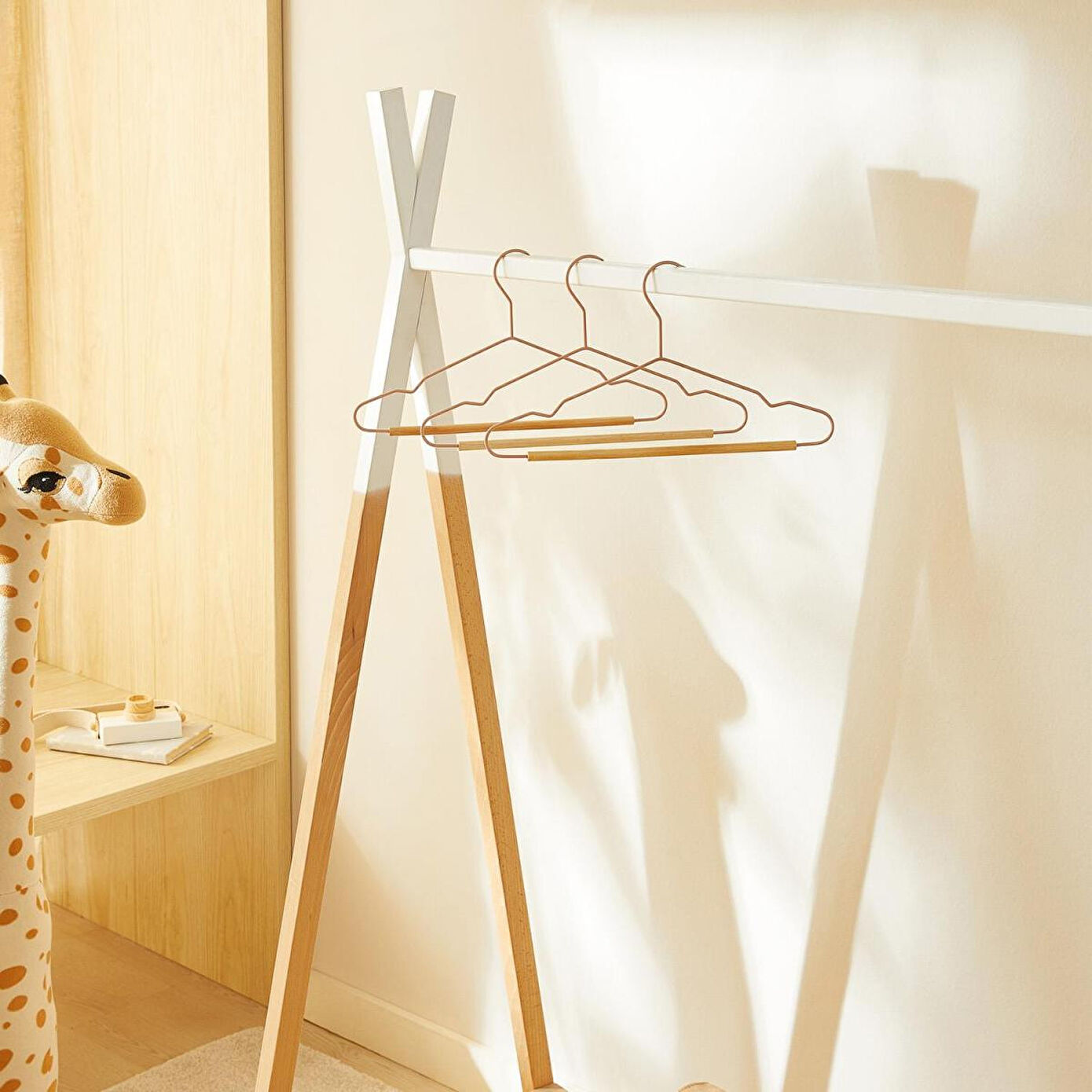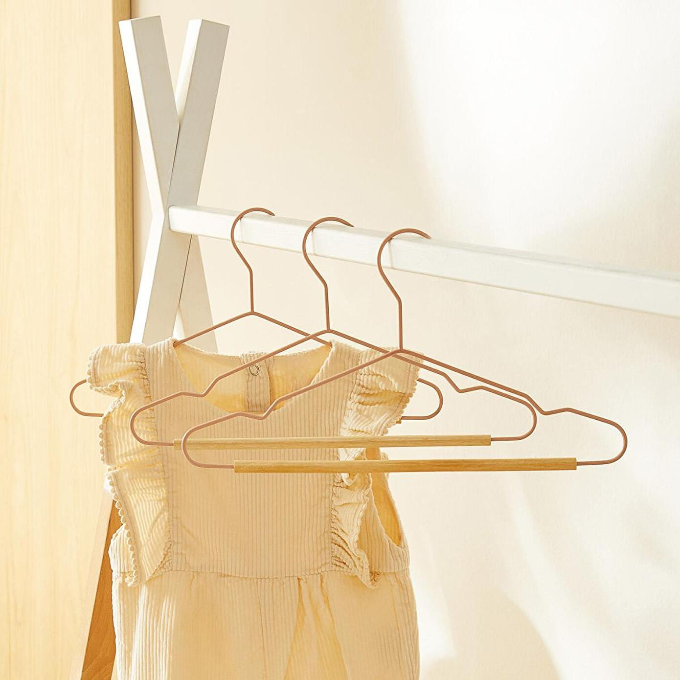 Çocuk kıyafet askıları zarif mat kauçuk kaplama detayıyla, kayma riskini en aza indirerek giysilerin kusursuzca yerinde kalmasını sağlar.