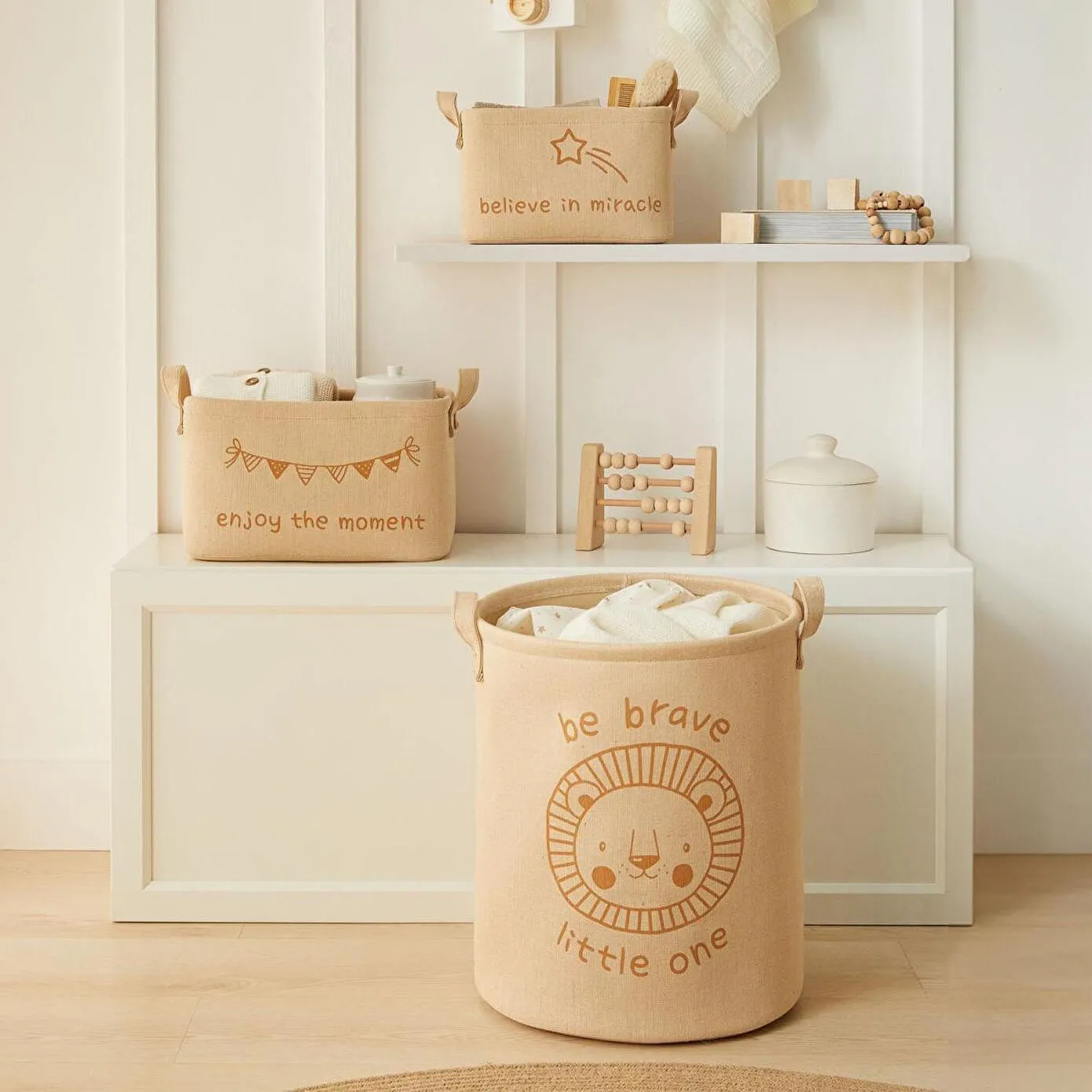 Pozitif mesajlı baskılarıyla ve doğal ipliklerden bir araya gelen kumaşlardan üretilen diğer sepet ve kutuları, çocuk odanızı tamamlamak ve bir bütünlük sağlamak için tercih edebilirsiniz.