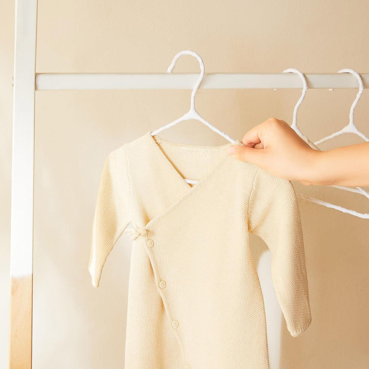 Bebek giysi askıları zarif kumaş kaplama detayıyla, kayma riskini en aza indirerek giysilerin kusursuzca yerinde kalmasını sağlar.