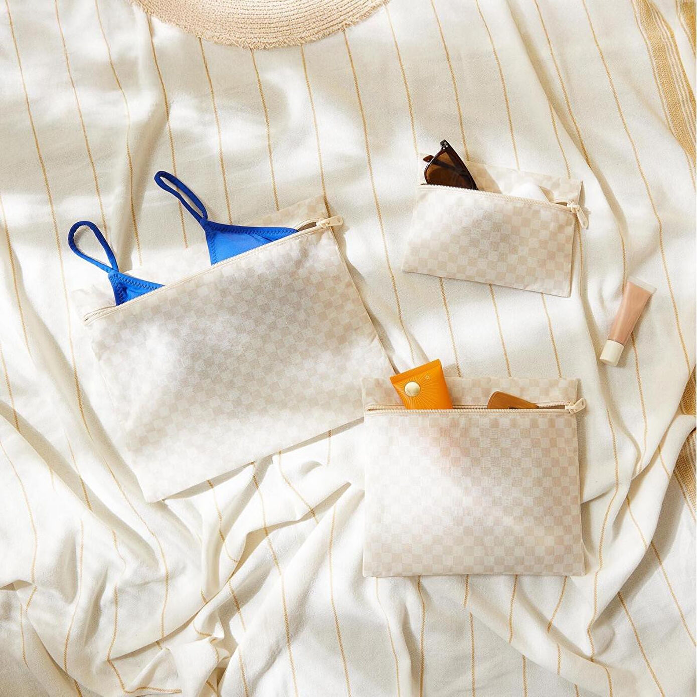 Ocean Home Textile 3'lü Su Geçirmez Pvc Astarlı Bej Dama Desen Islak Kuru Çantası 20 X 13 / 24 X 20 / 30 X 24 Cm