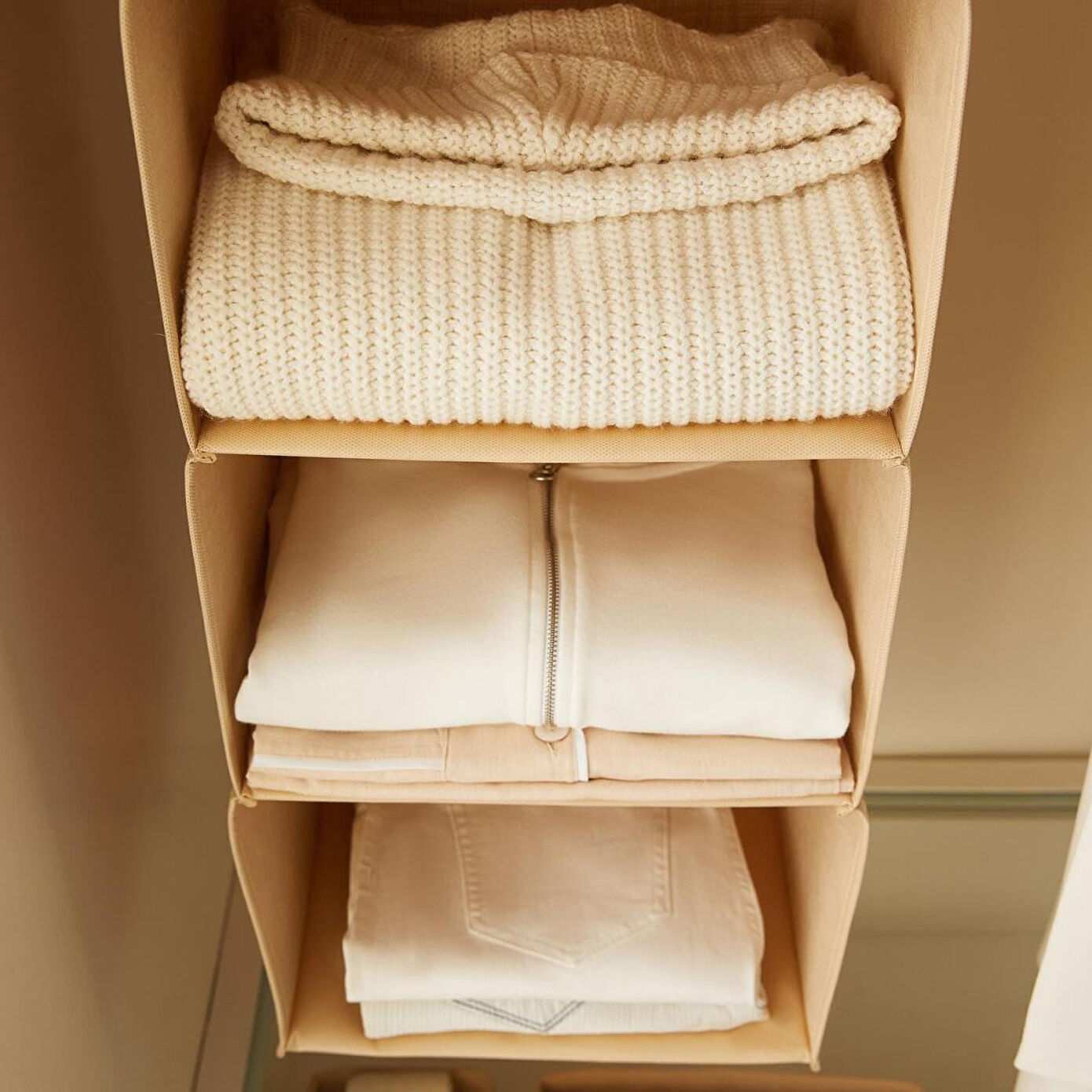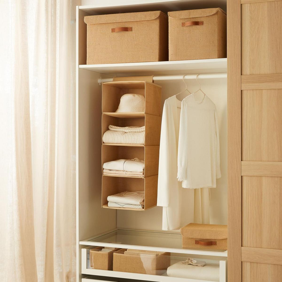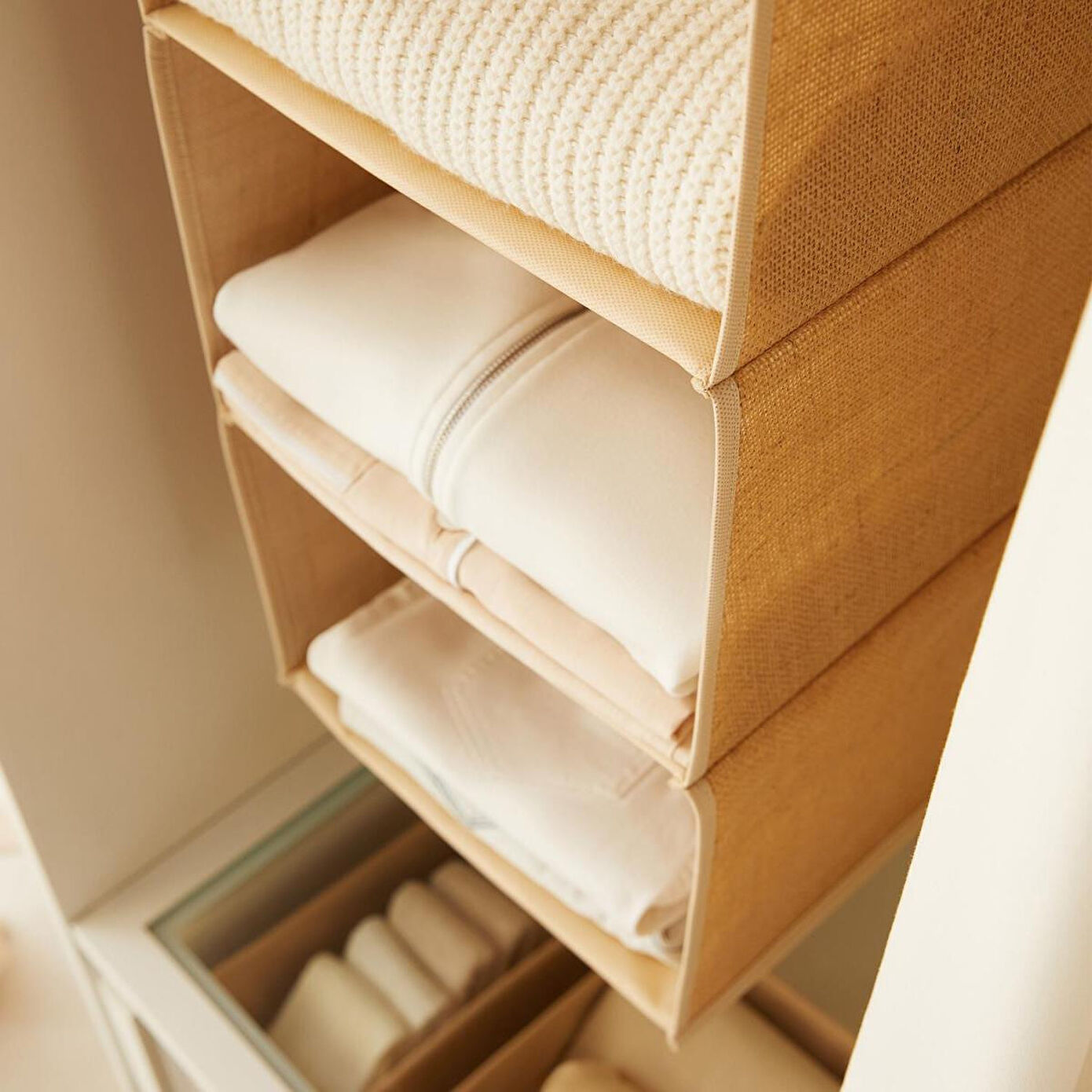 Askılı jüt dolap içi düzenleyici, katlanmış kıyafetler, iç çamaşırı, havlu, pijama, şapka gibi kıyafetleri ve aksesuarları saklamak için dolaplarınızda geniş bir alan sunar.