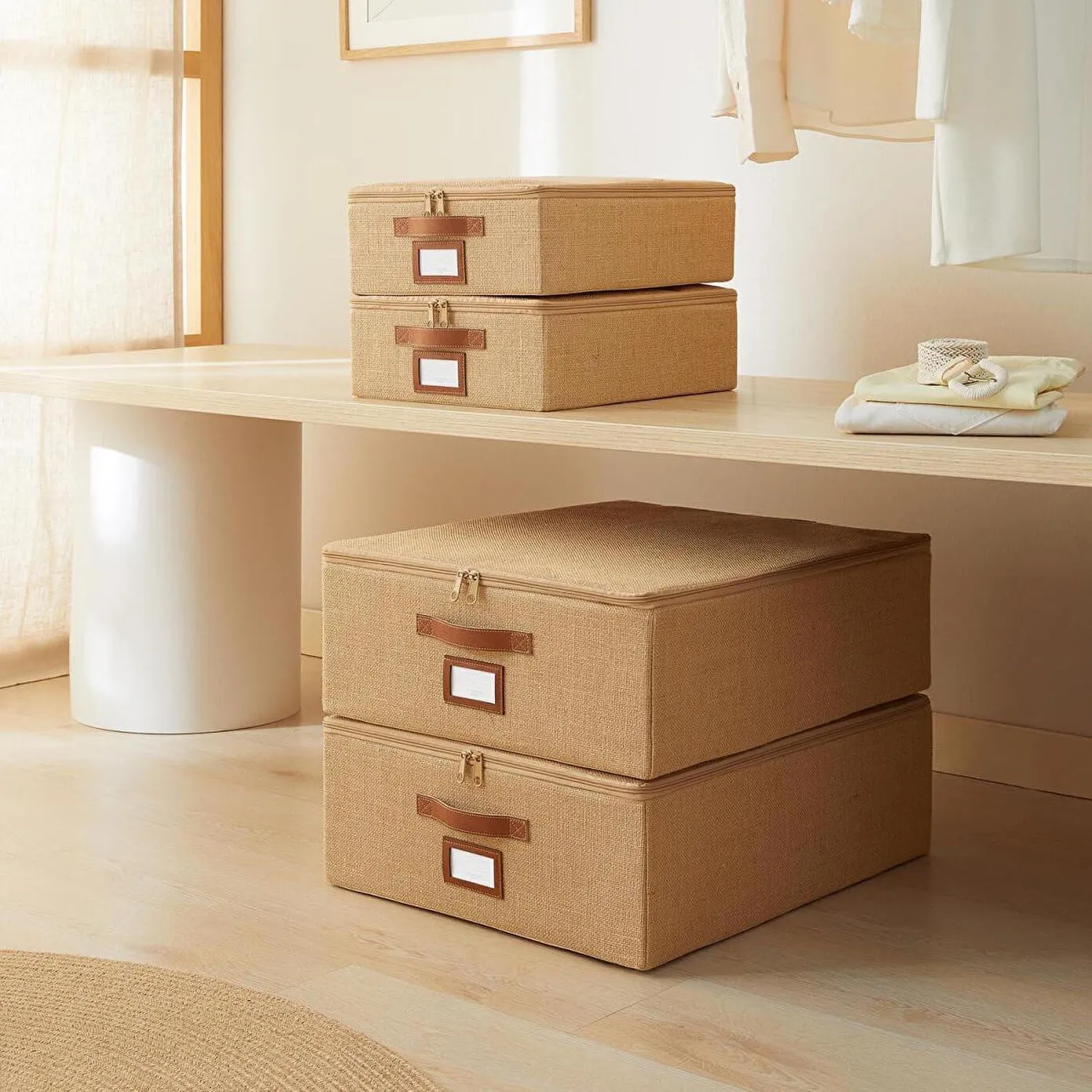 Jüt destekli kutu hurcun ön yüzeyinde bulunan deri görünümlü etiket koyma bölmesi sayesinde içerisine yerleştirilen eşyaları kolayca tanımlayabilirsiniz.