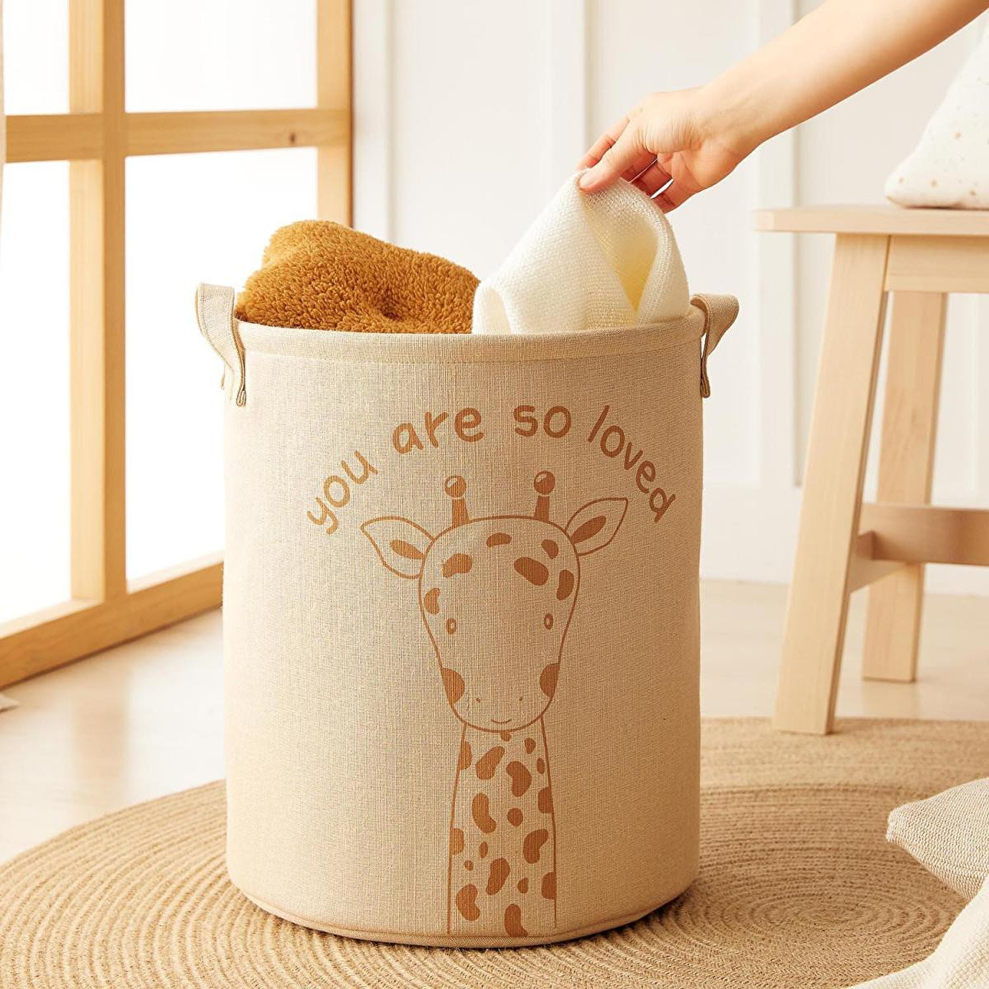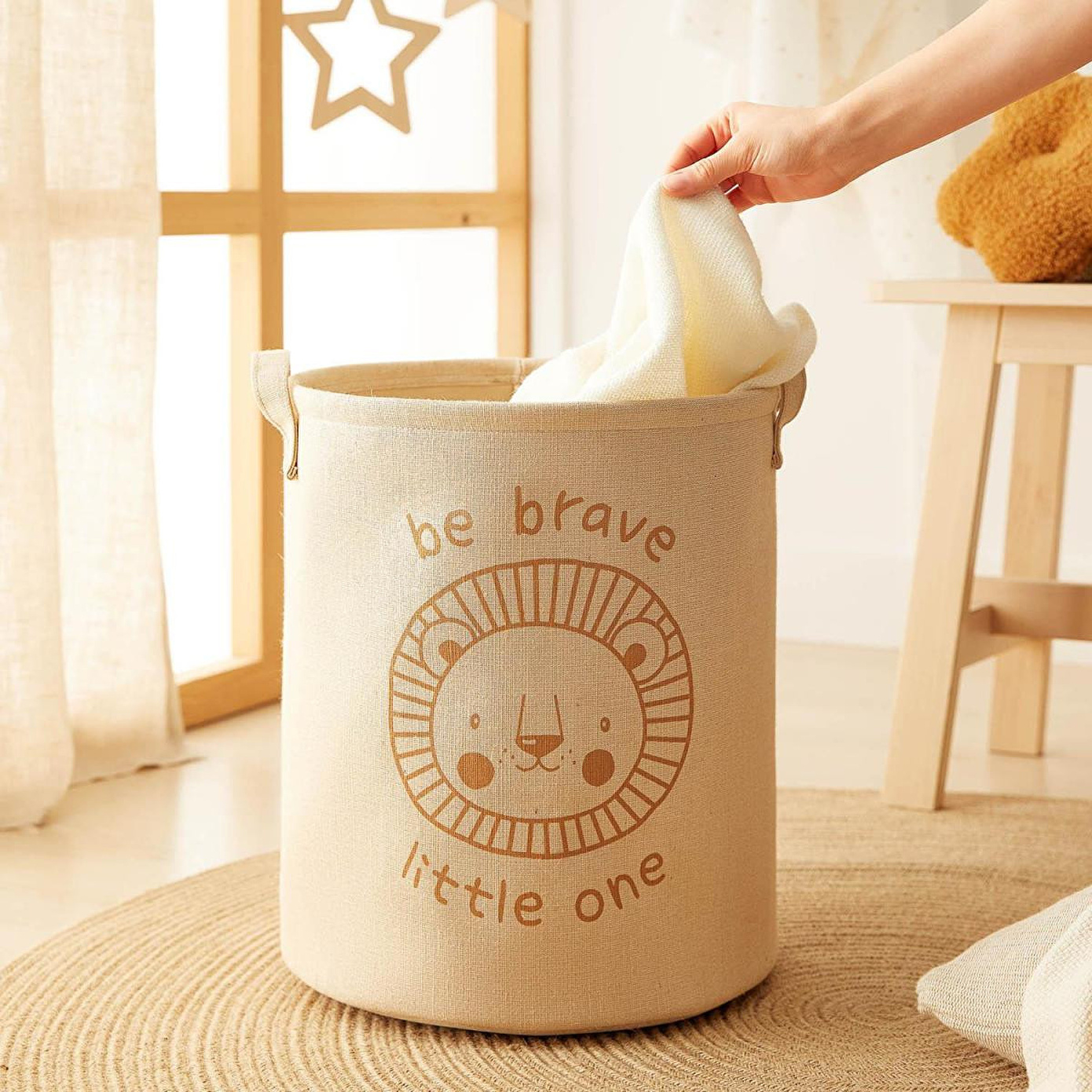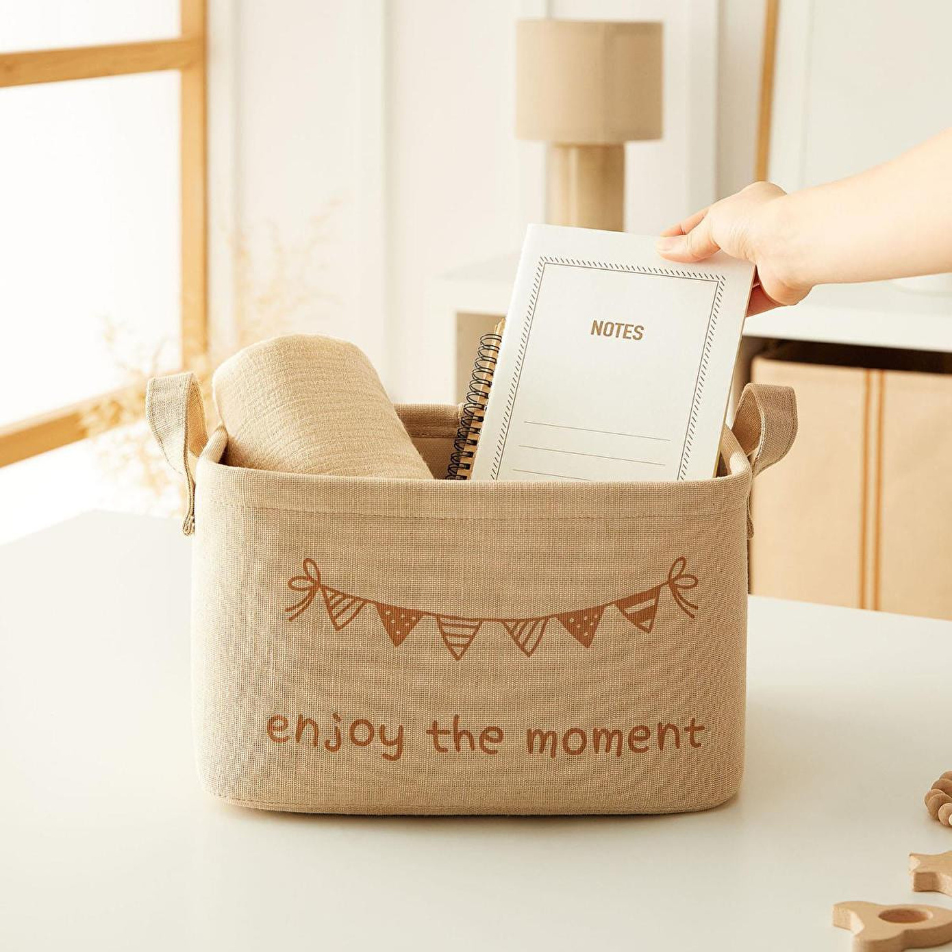 Pozitif mesajlı baskılarıyla ve doğal ipliklerden bir araya gelen kumaşlardan üretilen diğer sepet ve kutuları, çocuk odanızı tamamlamak ve bir bütünlük sağlamak için tercih edebilirsiniz.