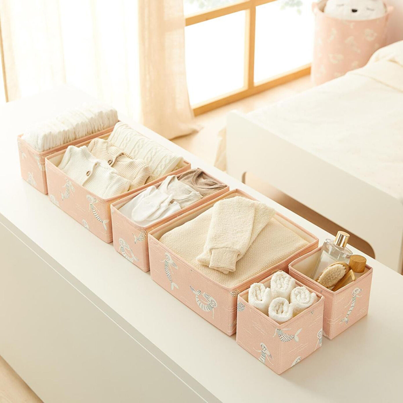 Çekmece içi kutular, Deniz Kızı Rüyası teması ile çocukların hayal gücünü harekete geçiren, renkli ve eğlenceli unsurlarla doludur. Çekmece içi kutular, denizlerin derinliklerinden gelen büyülü deniz kızlarını ve onların maceralarını yansıtarak, odalarda neşeli bir atmosfer yaratıyor. Çocukların eşyalarını düzenli tutarken, masalsı bir dünya sunarak hayal gücünü destekliyor.
