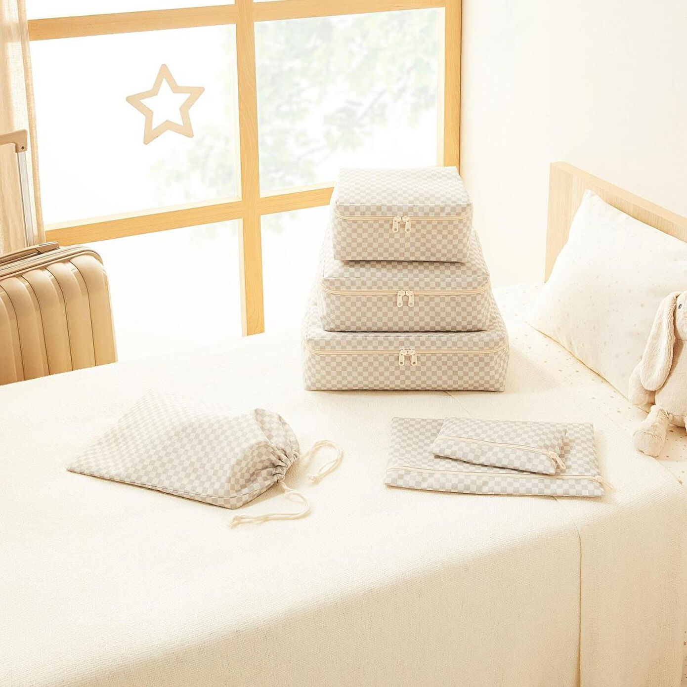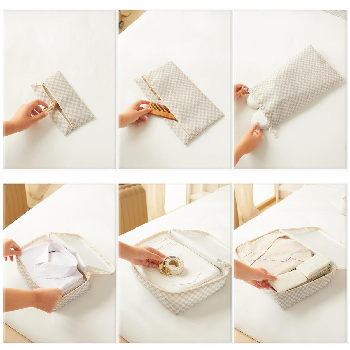 Set içerisinde yer alan küçük ve orta boy düzenleyiciler ile çamaşırları, ağzı büzgülü saklama torbası ile terlik ve ayakkabıları, fermuarlı çanta ile kişisel temizlik ürünlerini düzenleyebilirsiniz.