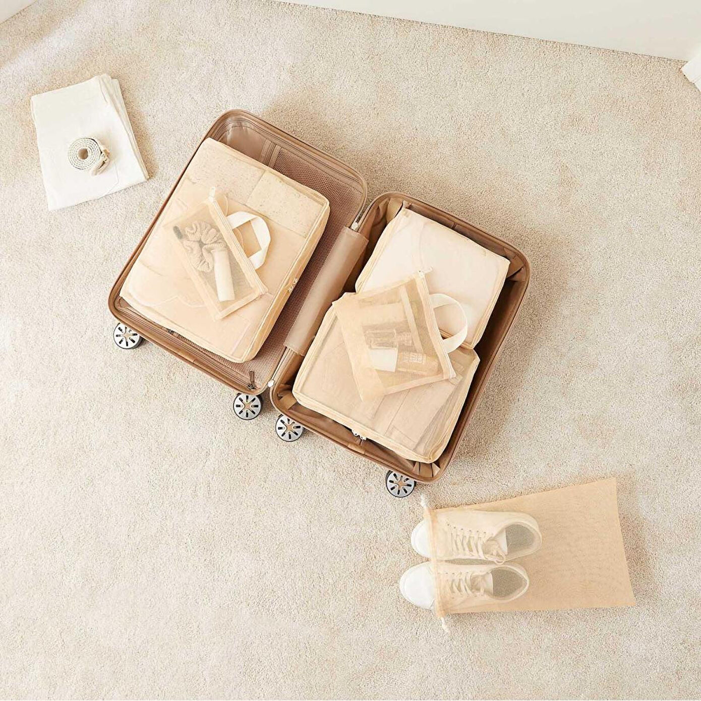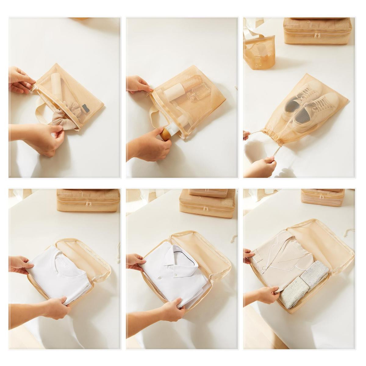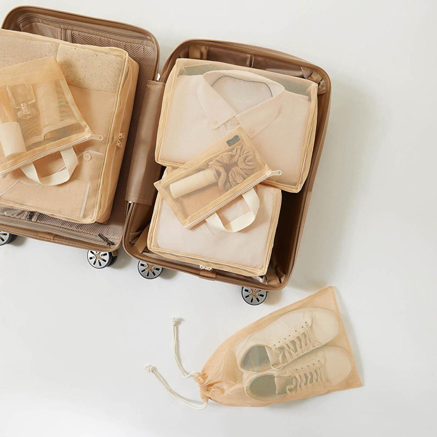 Set içerisinde yer alan düzenleyiciler ile çamaşırları, ağzı büzgülü saklama torbası ile terlik ve ayakkabıları, fermuarlı çanta ile kişisel temizlik ürünlerini düzenleyebilirsiniz.