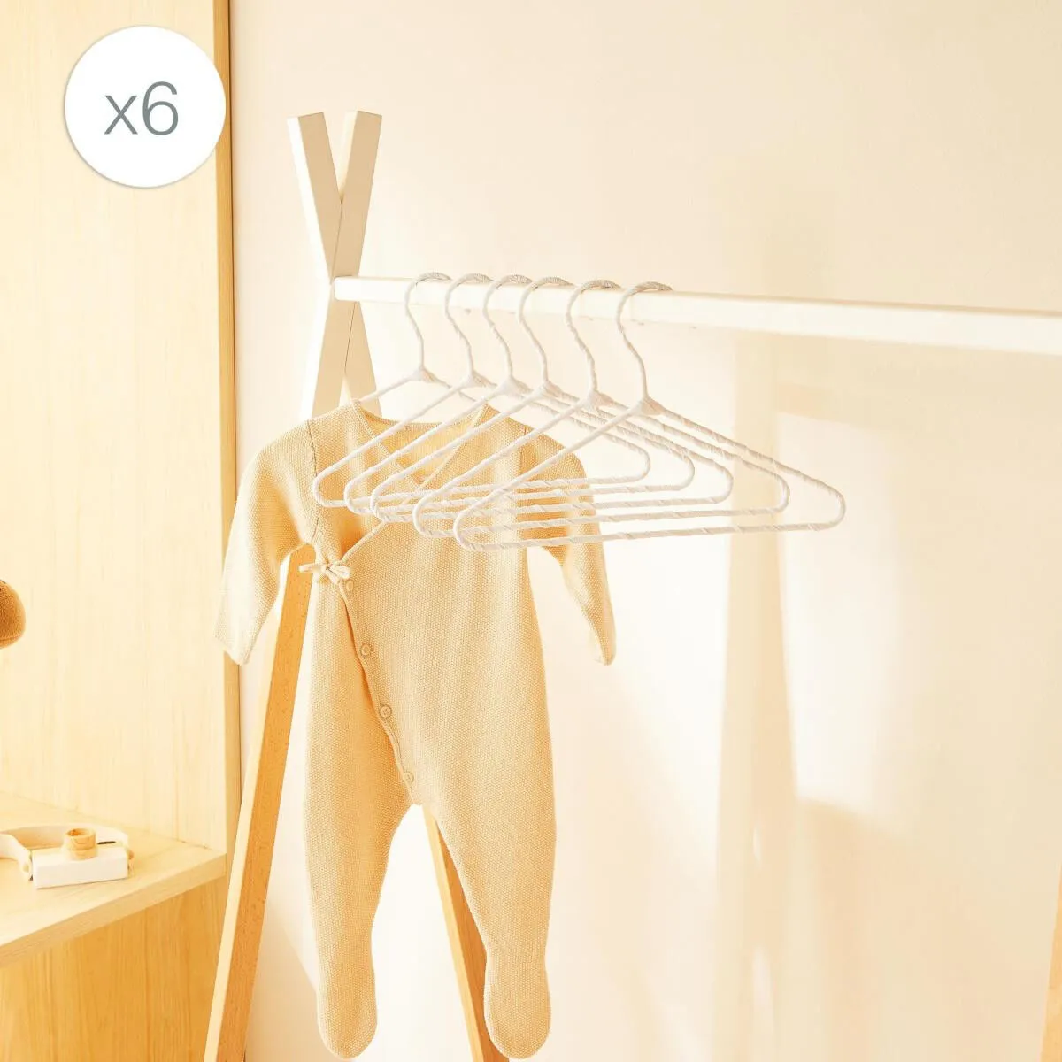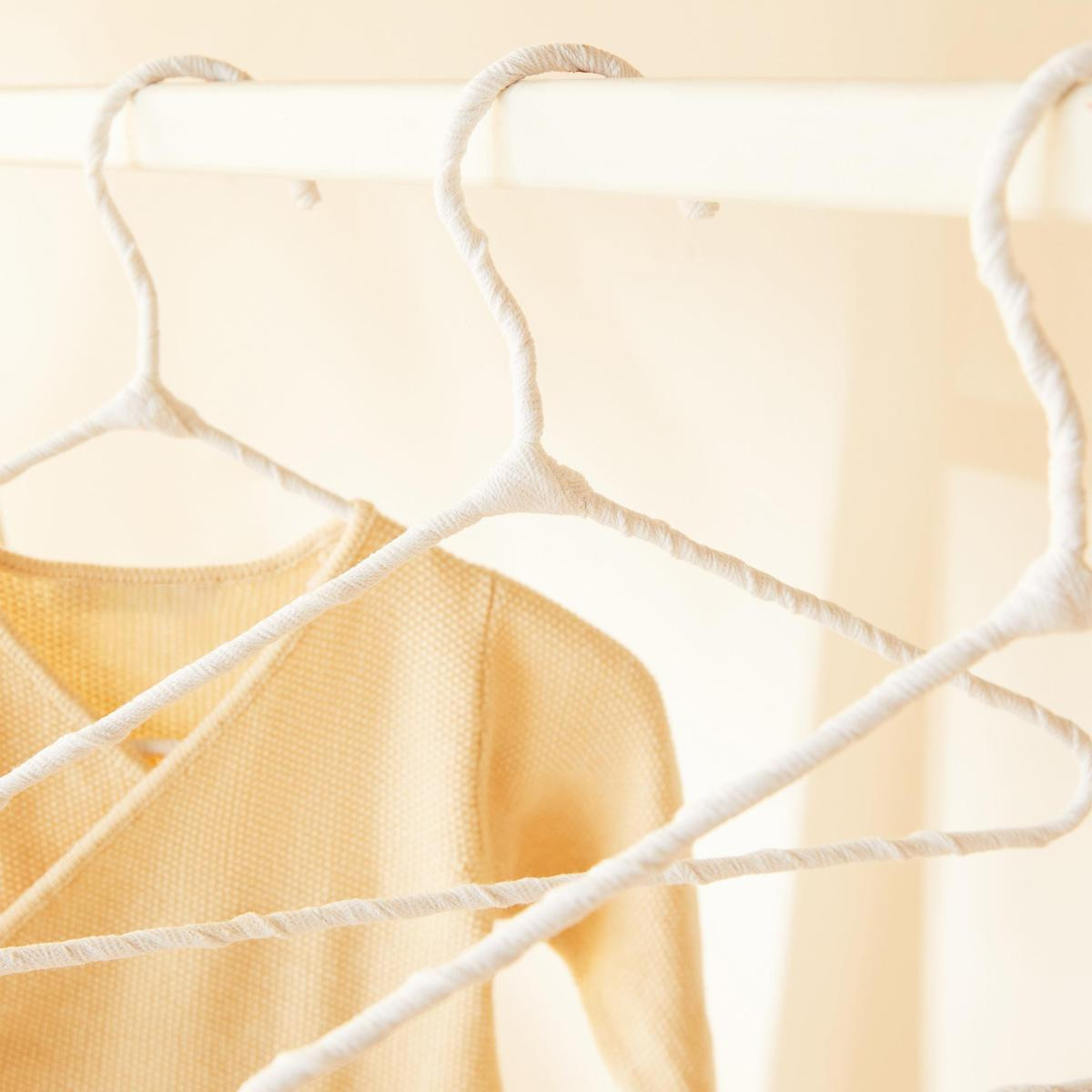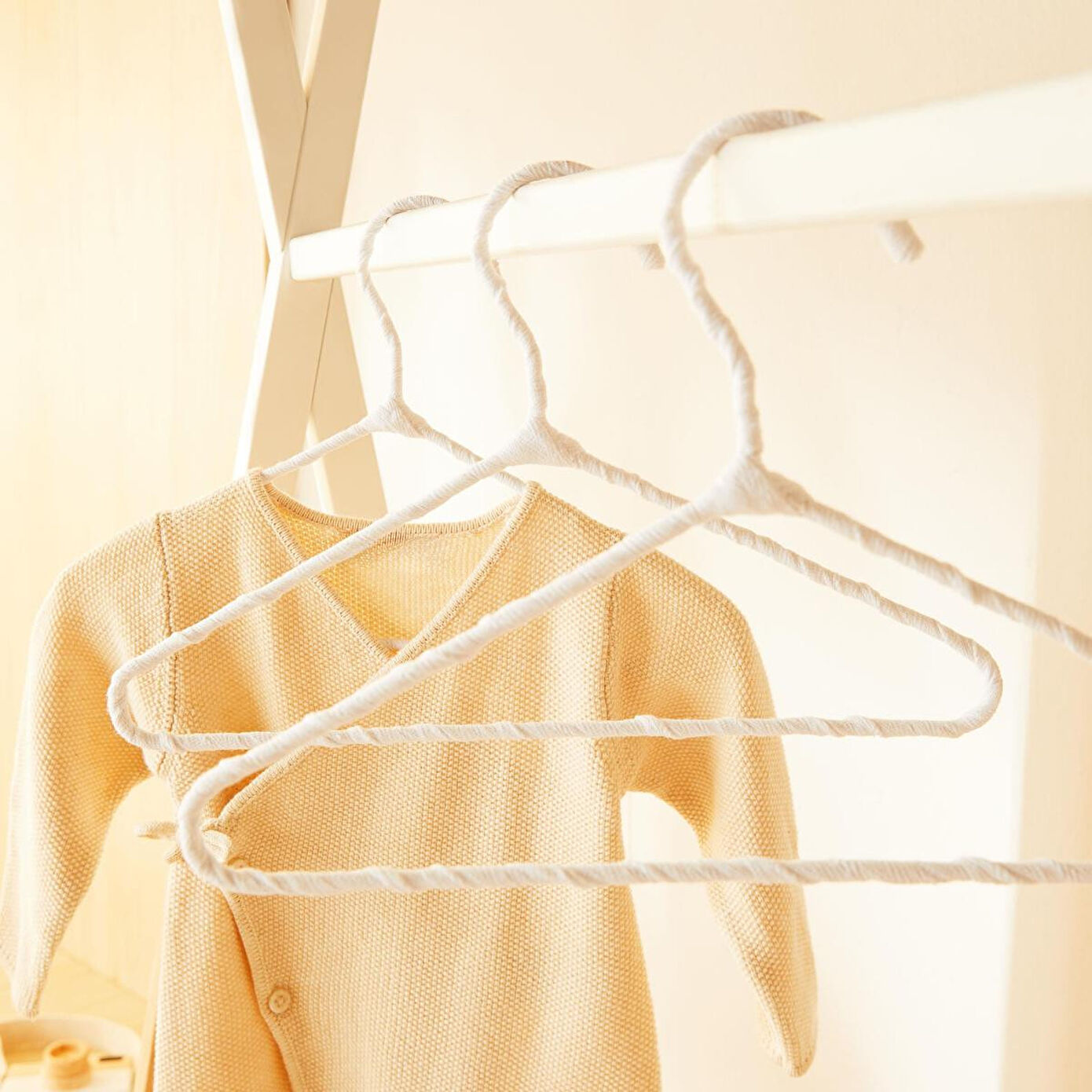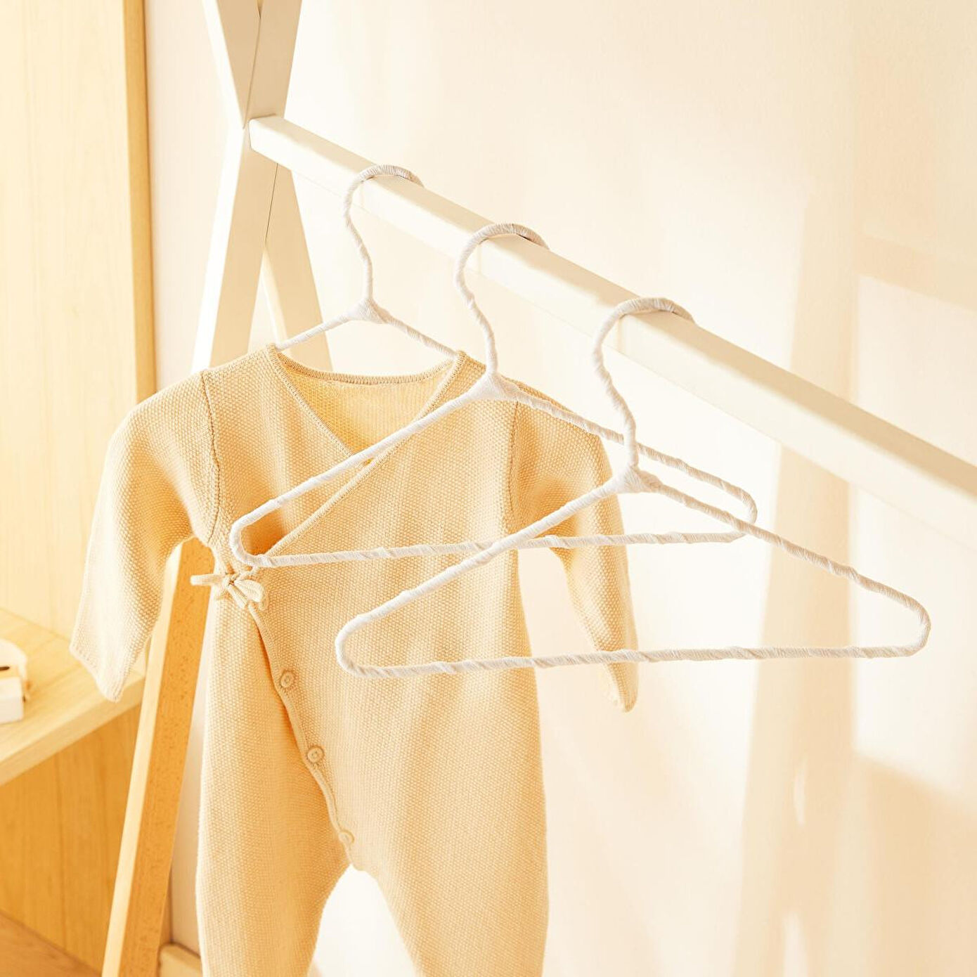 Bebek giysi askıları zarif kumaş kaplama detayıyla, kayma riskini en aza indirerek giysilerin kusursuzca yerinde kalmasını sağlar.