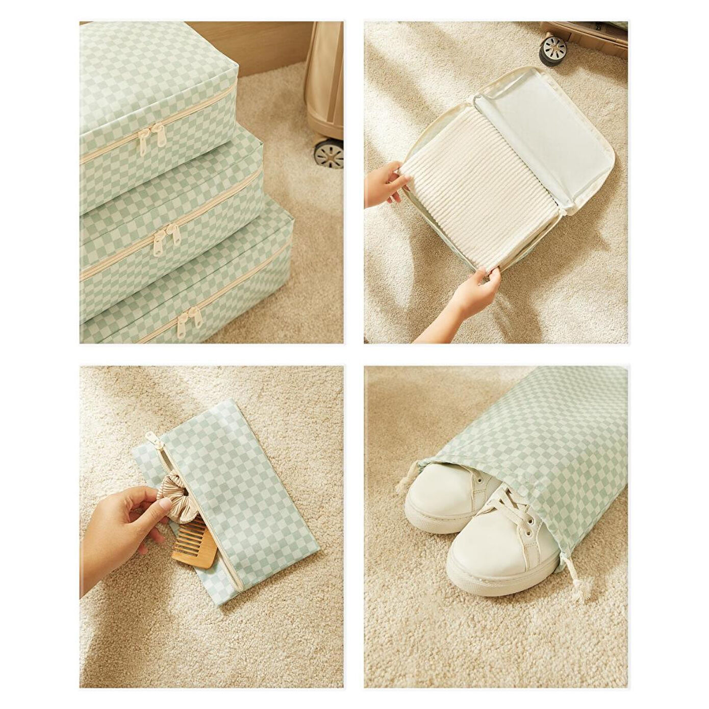Seyahatlerinizde bavul içlerini düzenlemek için kullanabileceğiniz gibi dolap içi düzenini sağlamak için de kullanabilirsiniz. Ayrıca, yeni doğum için hastane hazırlıkları yaparken bebek kıyafetlerini, bezlerini ve diğer ihtiyaçlarını düzenlemek için idealdir.Set içerisinde yer alan küçük ve orta boy düzenleyiciler ile çamaşırları, ağzı büzgülü saklama torbası ile terlik ve ayakkabıları, fermuarlı çanta ile kişisel temizlik ürünlerini düzenleyebilirsiniz.