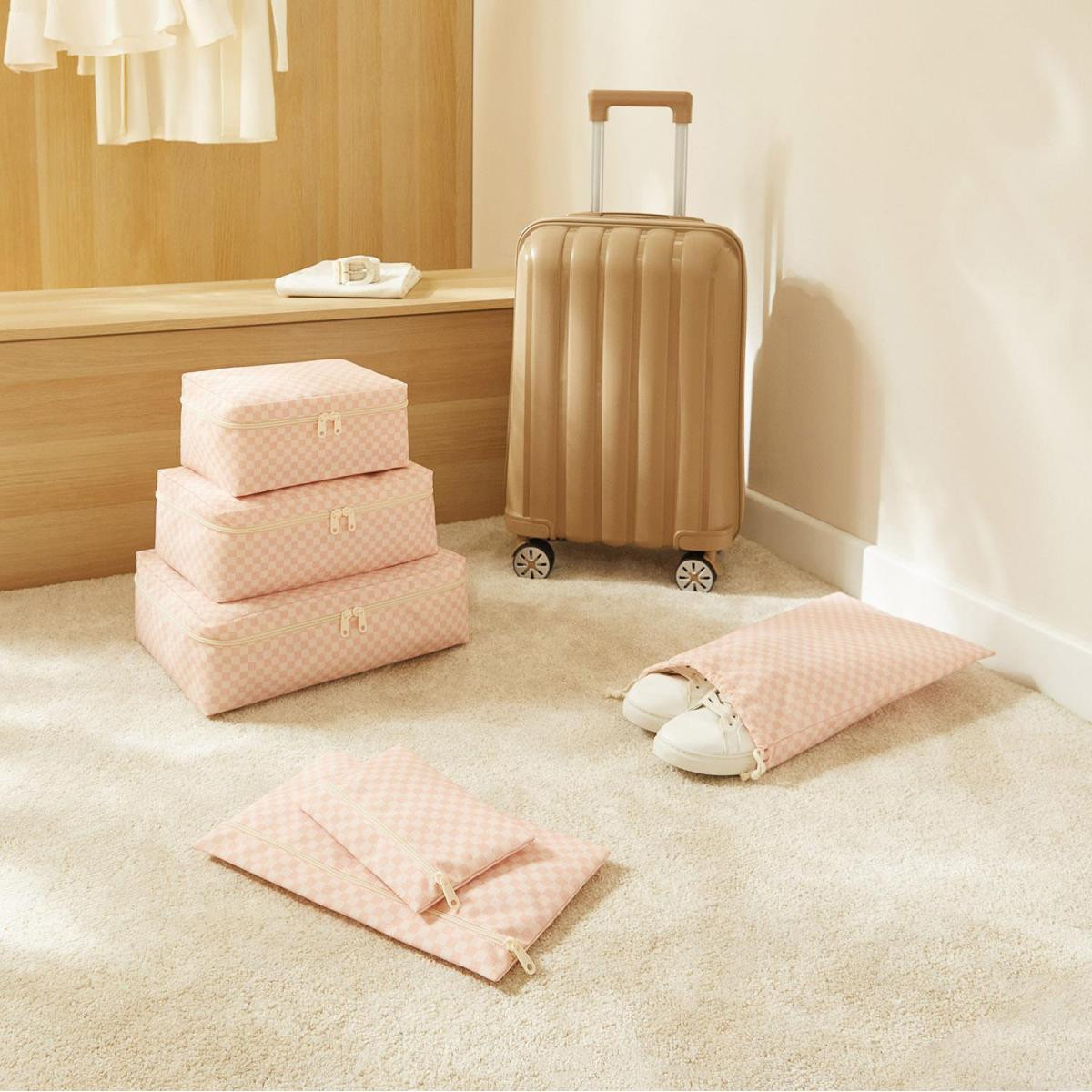 Ocean Home Textile 6'lı Pembe Dama Desen Pamuklu Bavul İçi Düzenleyici Set