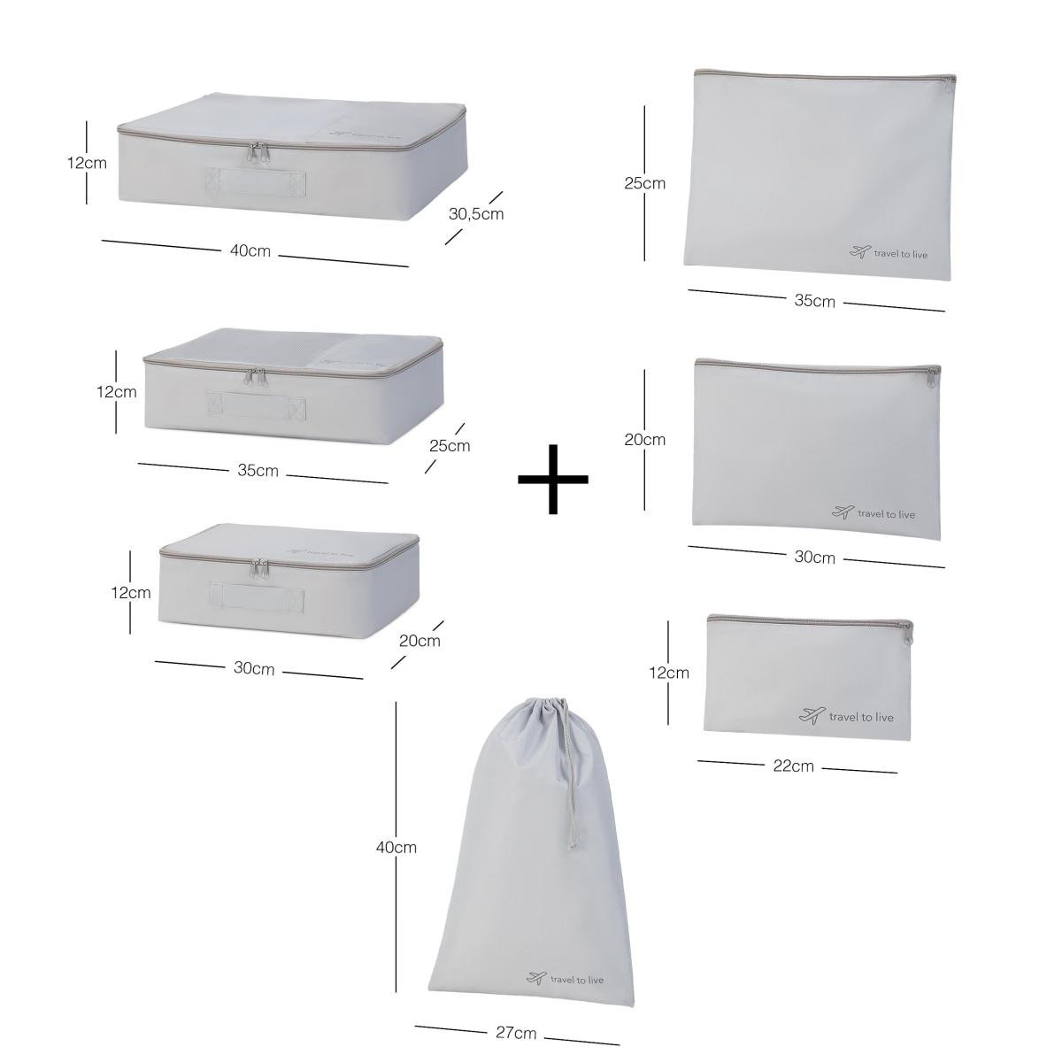 Set içerisinde yer alan küçük, orta ve büyük boy düzenleyiciler ile çamaşırları, ağzı büzgülü saklama torbası ile terlik ve ayakkabıları, fermuarlı çantalar ile kişisel temizlik ürünlerini düzenleyebilirsiniz.