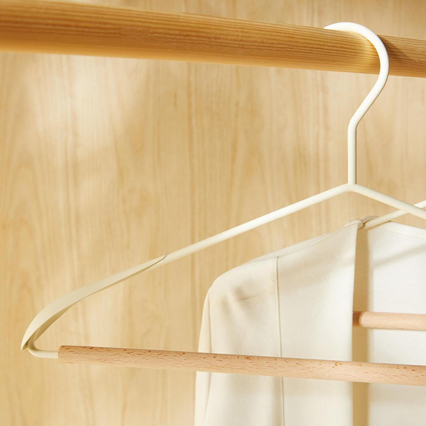 Alt kısmında yer alan pantolon askı çubuğu, takım elbiseler için pratik ve düzenli kullanım sağlar. Şık ve doğal ahşap görünümü sayesinde yatak odası, dolap, banyo, vestiyer çamaşır odası gibi her alanda kullanılabilir.