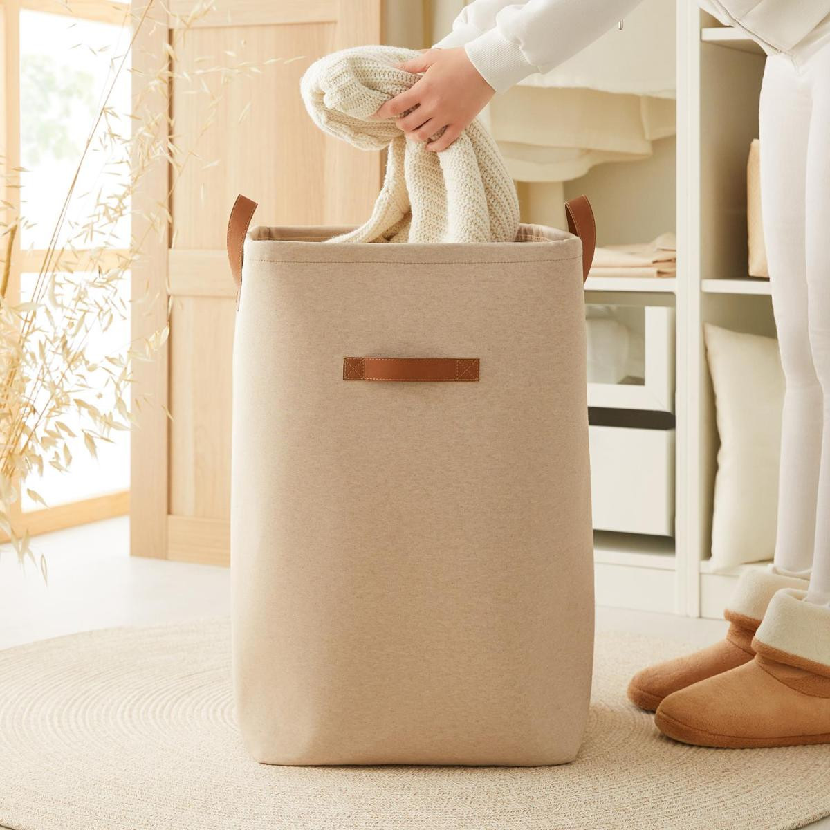 Pamuklu kumaştan üretilmiş çamaşır sepeti, farklı tasarımıyla çamaşır yıkama ve düzenleme alanlarında kullanıma uygundur.