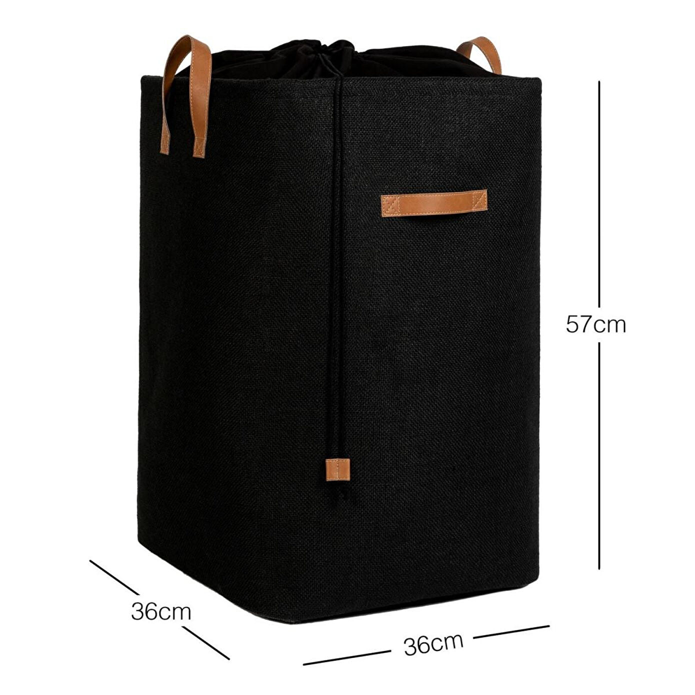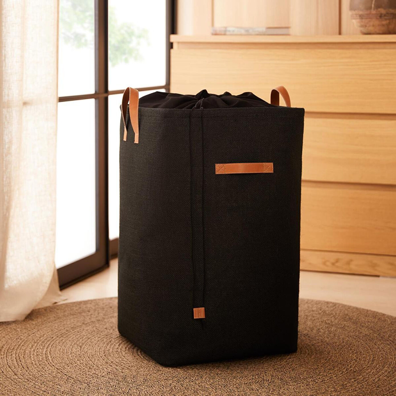 Siyah jüt kumaştan üretilmiş çamaşır sepeti, farklı tasarımıyla çamaşır yıkama ve düzenleme alanlarında kullanıma uygundur.